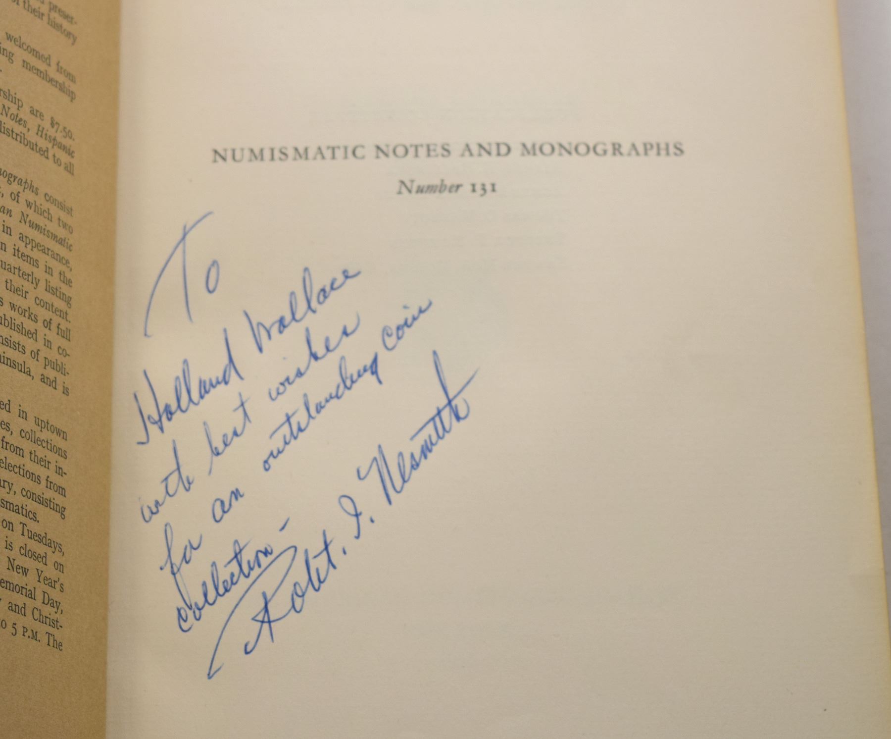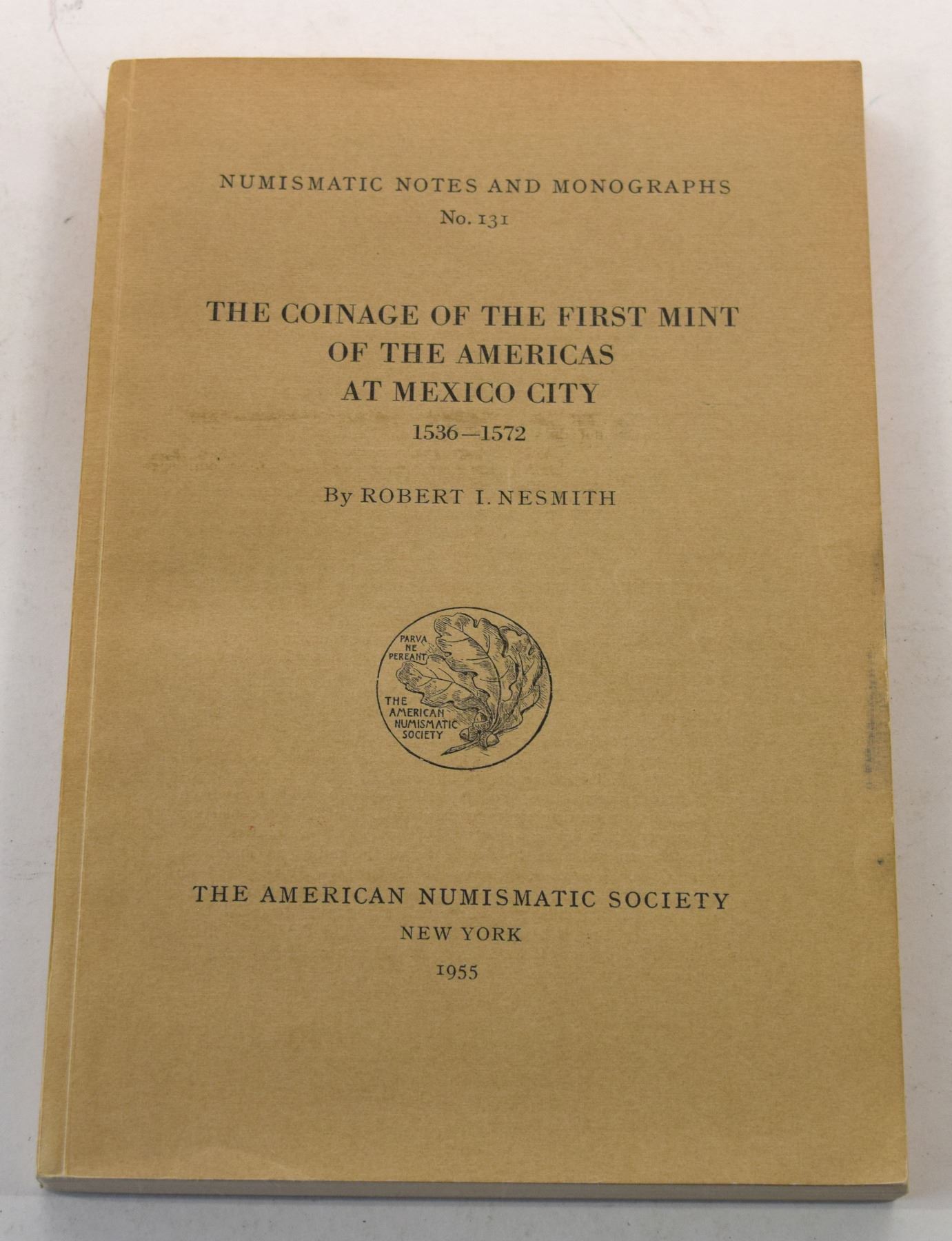 Nesmith, Robert I. (Signed) THE COINAGE OF THE FIRST MINT OF THE AMERICAS AT MEXICO CITY 1536-1572. The American Numismatic Society. 1955. 12mo, 139 pages; Softcover; Inscribed by the author; Numismatic Notes and Monographs No. 131.; This book is illustrated with black and white photos and hand-drawn illustrations of the subject coins and details. Topics include: the foundation of the Mexico City mint, mint officials and workers, mint techniques: die making and coining, the silver and copper coinage, metrology, Coin catalogue: early series R, early series G-F-P, Late series G-A-R-S-L-O (with table of design varieties), and copper coinage. Each series is organized by assayer and then sub-organized by denomination. Each denomination has a description of obverse and reverse details and a discussion on varieties. Subject: Coinage - Mexico