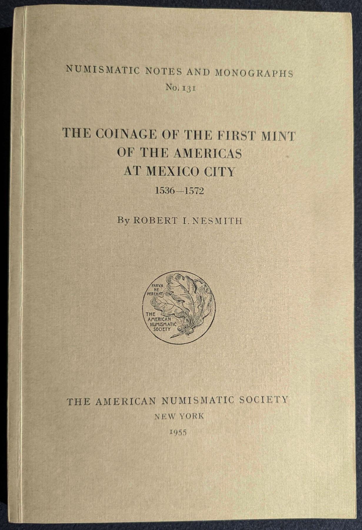 Nesmith, Robert I. THE COINAGE OF THE FIRST MINT OF THE AMERICAS AT MEXICO CITY 1536-1572. The American Numismatic Society, New York. 1955. 12mo. vii, (1), 139, (1) pages. Original tan printed card covers. Numismatic Notes and Monographs No. 131. Line illustrations throughout. 13 + (6) fine plates. Fine. This book is a history and guide to the Carlos and Johanna series of Mexican silver coinage. Topics include: the foundation of the Mexico City mint, mint officials and workers, mint techniques: die making and coining, the silver and copper coinage, metrology, Coin catalogue: early series R, early series G-F-P, Late series G-A-R-S-L-O (with table of design varieties), and copper coinage. Each series is organized by assayer and then sub-organized by denomination. Each denomination has a description of obverse and reverse details and a discussion on varieties. Lot weight: 0 lbs 11oz. Subject(s): Mexican Coinage.