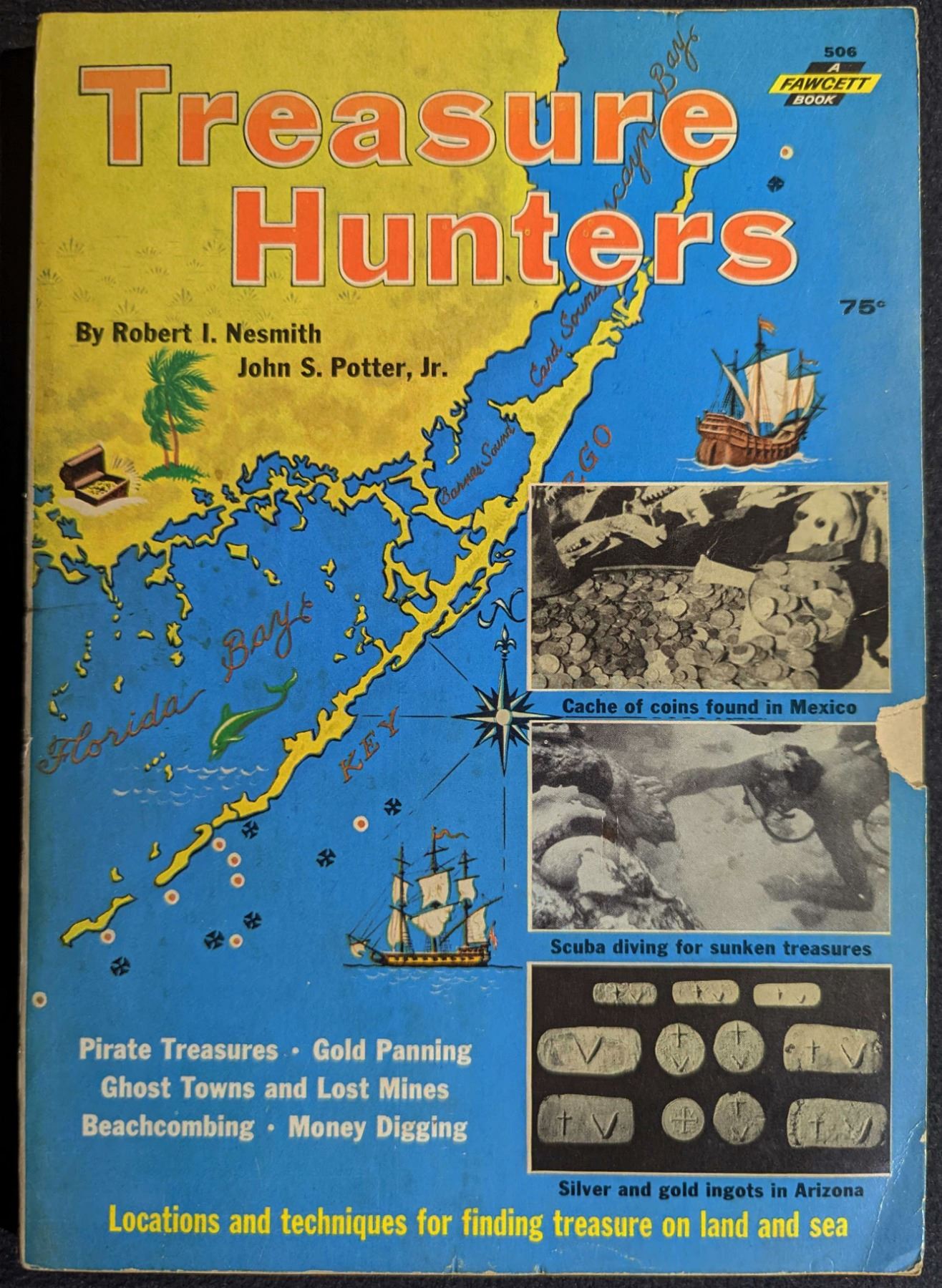 Nesmith, Robert I. & John S. Potter. TREASURE HUNTERS. Fawcett Publications, Inc. 1961. 8vo. 144 pages. Greenwich. first edition. original pictorial card covers, chip out of front cover. illustrated. Very Good. This book is formatted like a magazine and has approximately 14 articles on all facets of treasure hunting from gold panning to pirate treasure to beachcombing to ghost town hunting. There is a great article on the early salvage efforts of C.E.D.A.M and Bob Marx on the Matanceros wreck and a great article on shipwreck salvaged ingots and cobs. One of the earliest popular books on lost treasure and treasure finders. Lot weight: 0 lbs 7oz. Subject(s): Buried, Sunken Treasure.