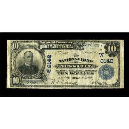 <B>Ness City, KS</B></I> - $10 1902 Plain Back Fr. 626 <B>The NB of Ness City</B></I> Ch. # (W)8142<BR>A tougher large note from the last of the three banks chartered here. Pen signed <B>About Fine,</B></I> with a small margin split on the left side.<BR><BR><b>Shipping:</b> Coin/Currency (<a target="_blank" href="http://www.heritageauctions.com/common/shipping.php">view shipping information</a>)