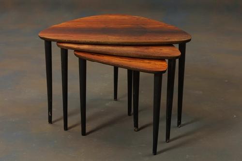 Nest of tables, three pieces, teak with black painted legs, C1960, H 41-46, L 45-69.