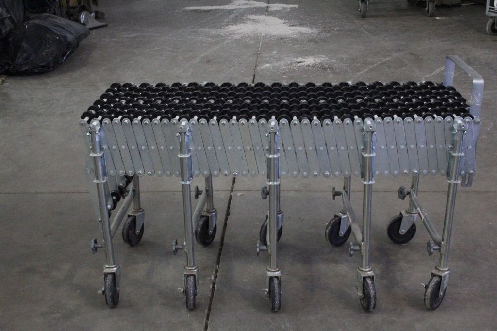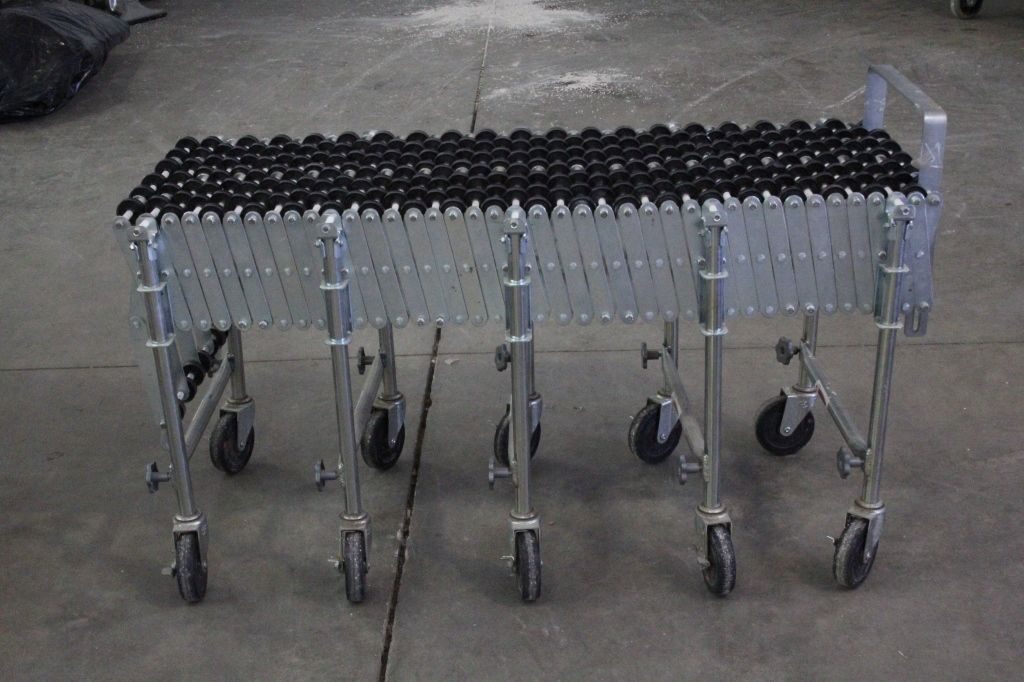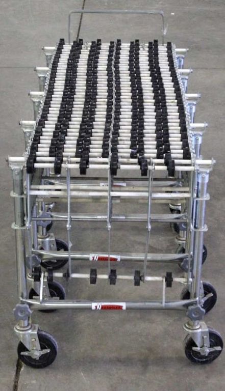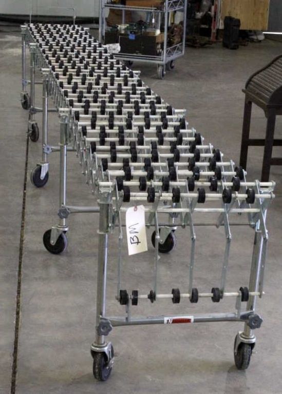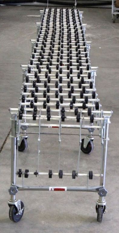 Nestaflex 226 Series Expandable/Portable Skatewheel Conveyors. The piece can bend and sells for over $1,500 new. This is an Industrial piece that shows a rolling top and can be used to push things across. Thiswould be great for use in airports, box sorting, mail rooms, and any type of assembly. The piece is well made. Measures 209.5" (17 ft 5.5 in) expanded and 54.25" collapsed and 23"x32"