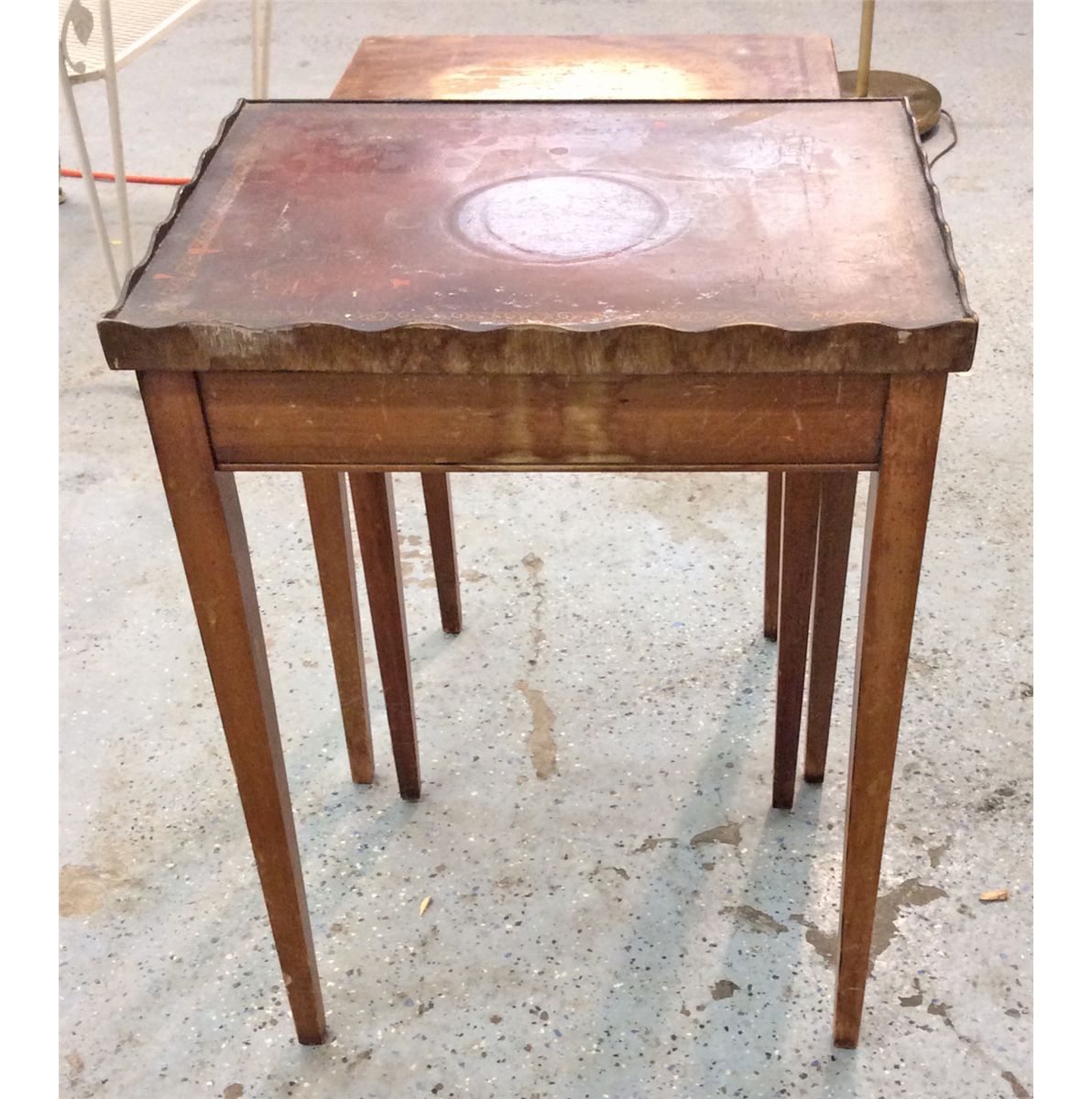 A pair of Nesting tables one measures 22.5 in. tall 1 in. deep 16 in. wide, second table measures 13.5 wide 10.5 in deep 22 in. tall sun bleached damaged.