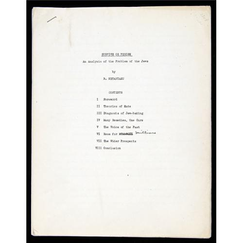 <Our item number 109779><B>Netanyahu, Ben-Zion.</B> Typed 38-page draft of a manuscript by Ben-Zion Netanyahu, father of former Israeli prime minister Benjamin Netanyahu, titled "Survive or Perish, An Analysis of the Problem of the Jews," n.p., n.d (during World War II). Very good; many holograph corrections and annotations; light toning and soiling. Ben- Zion Netanyahu, was a professor of Jewish history, a former editor of the Hebrew Encyclopedia, and a former senior aide to Zeev Jabotinsky. The paper addresses issues such as "Theories of Hate," and "Diagnosis of Jew-bating," going into the history of anti-Semitism, discussing the history of Palestine, and explaining why he feels that a Jewish homeland in Palestine could be the answer to the "problem." A fascinating paper written as the Holocaust took place. <BR>Estimated Value $400-600. <BR><BR>Our item number 109779<BR><IMAGES><P ALIGN="CENTER"><IMG SRC="http://64.60.141.195/photos/40jpegs/109779.jpg"> </P></IMAG ES>
