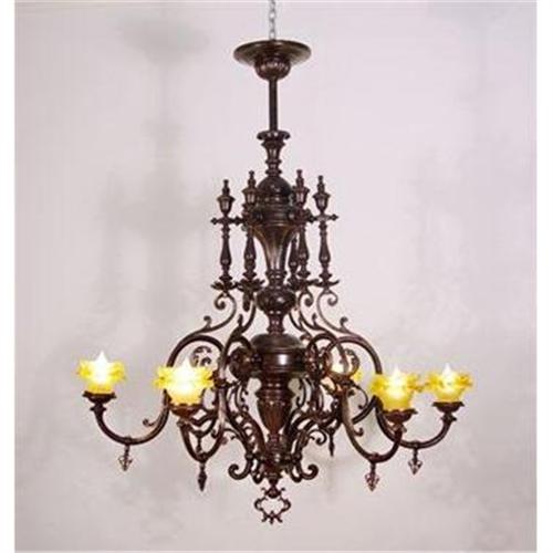 This Six Light Netherlandish Bronze and Brass Chandelier is in Excellent Condition, c. late 19th century. Originally gas, recently wired for electricity with French hand blown glass flower bobeches by Vianne. Fabulous for numerous designs measuring 34?Dia x 42 3/4? H, please view and zoom to enjoy, serious inquiries are welcome!