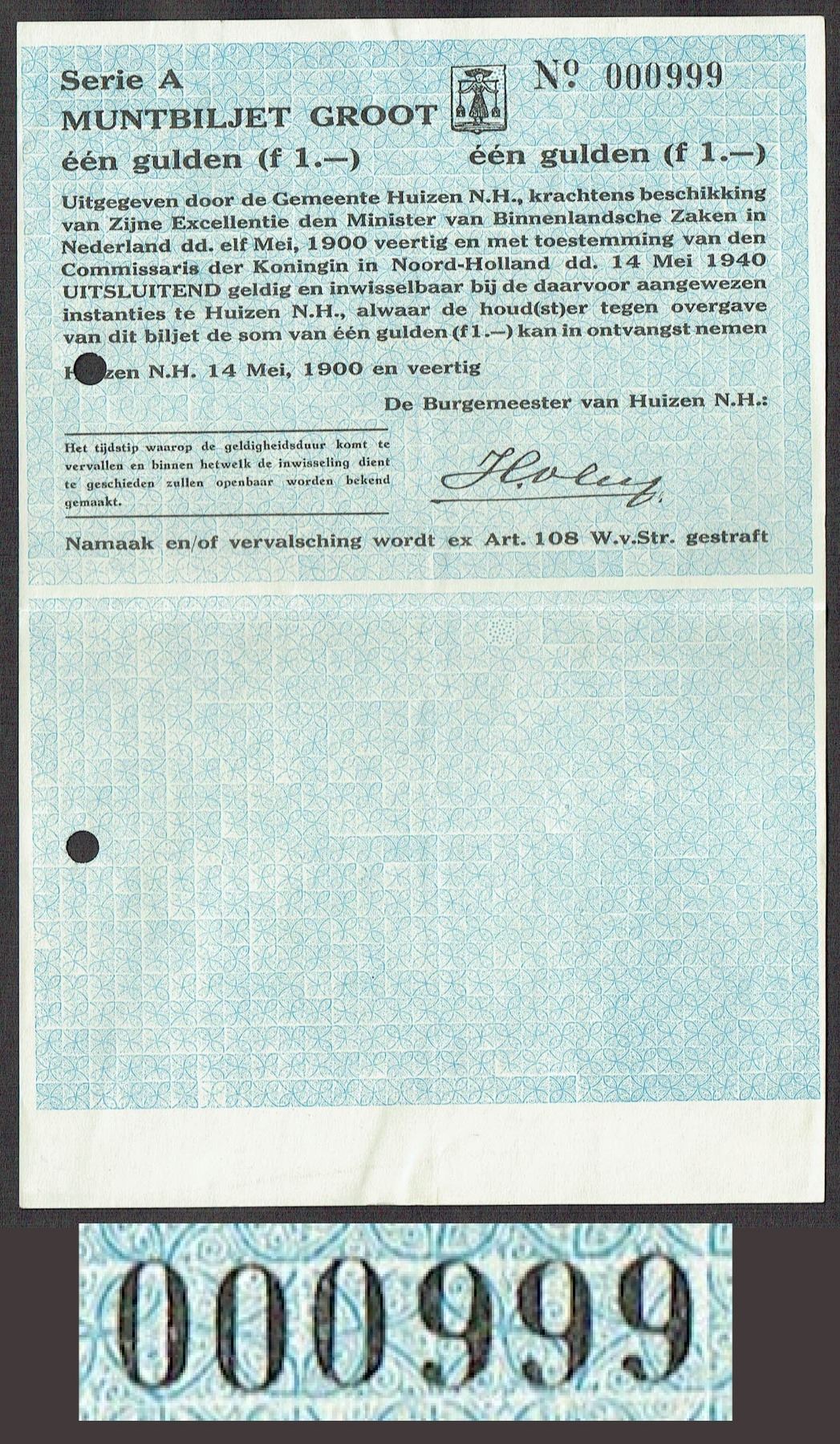 Netherlands 1 Gulden 1940 Huizen Noord-Holland Noodgeld ZF/PR - VF/XF Emergency Money Serial number 000999! PL605.3 (collection A.M. van de Waal)