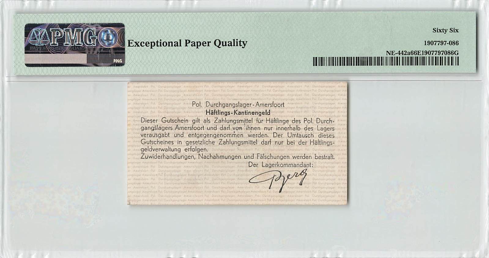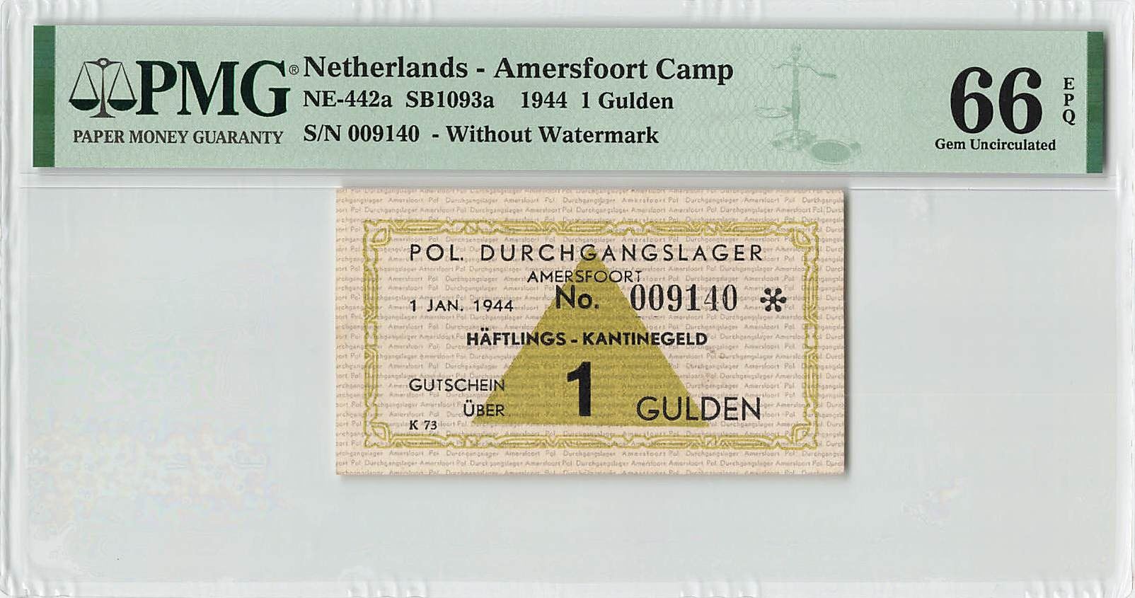 Netherlands 1 Gulden 1944 without Watermark with Star Concentration Camp Amersfoort Pol. Durchgangslager Haftlings - Kantinegeld Gutschein PMG Gem UNC 66 EPQ