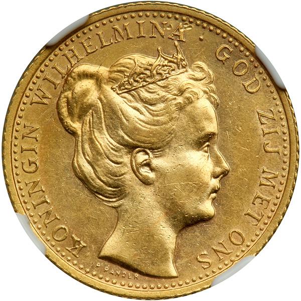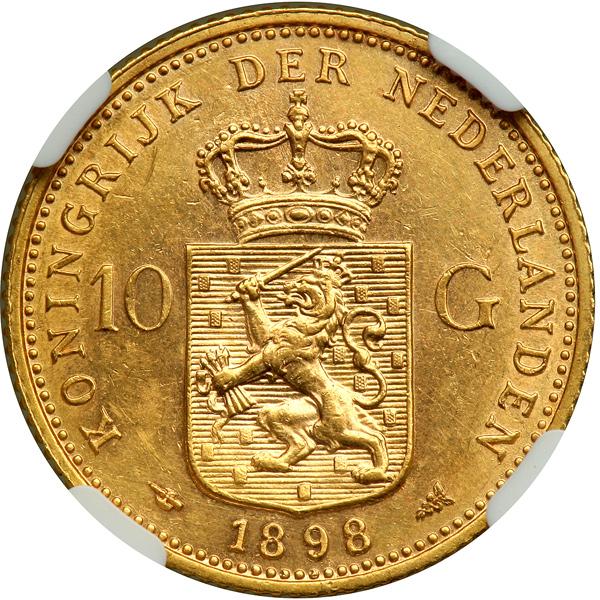 Netherlands. 10 Gulden, 1898. Fr-348; KM-124. Weight 0.1947 ounce. Wilhelmina, 1890-1948. Large head with coronet. One year type. Lightly cleaned. Lustrous. NGC graded Extremely Fine Details.
