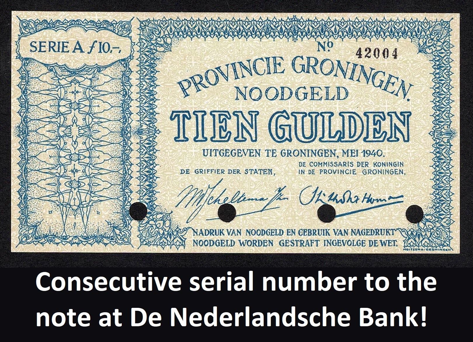 Netherlands 10 Gulden 1940 Groningen Noodgeld PR/UNC - EF/UNC Emergency Money without watermark PL475.3.a (collection A.M. van de Waal)