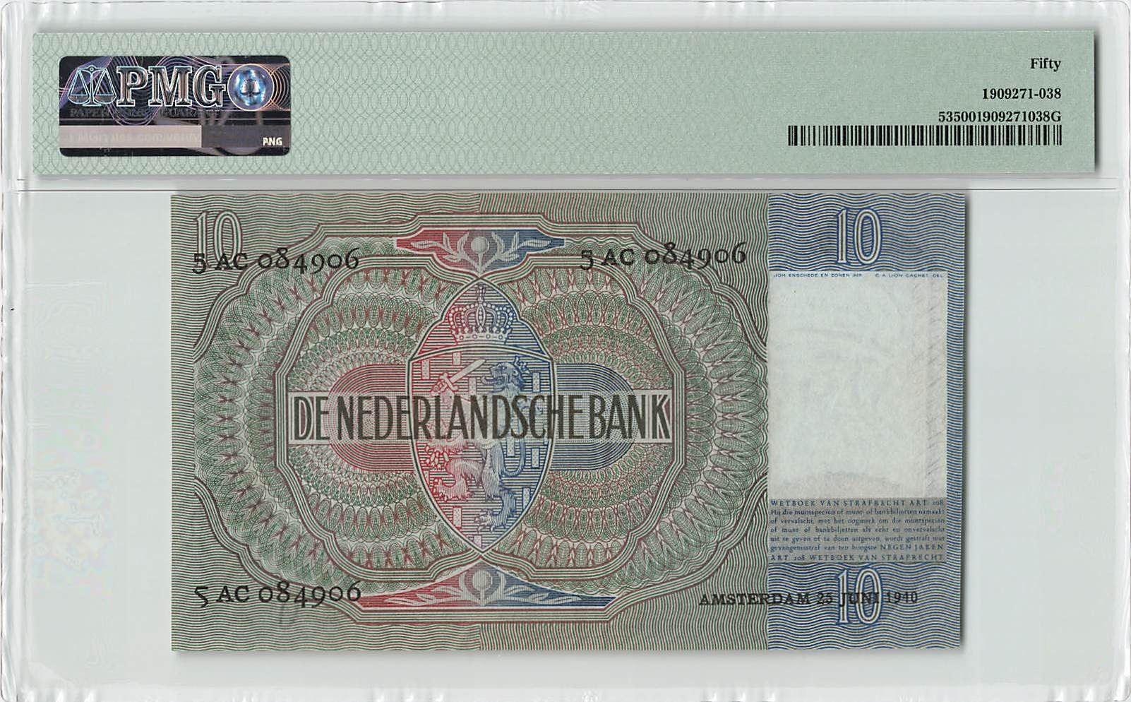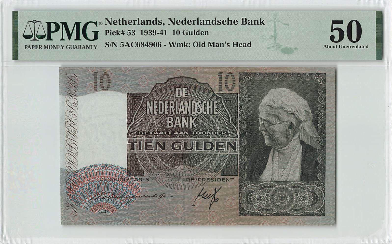 Netherlands 10 Gulden 1940 Queen Emma Pick 53 PMG About Uncirculated 50
