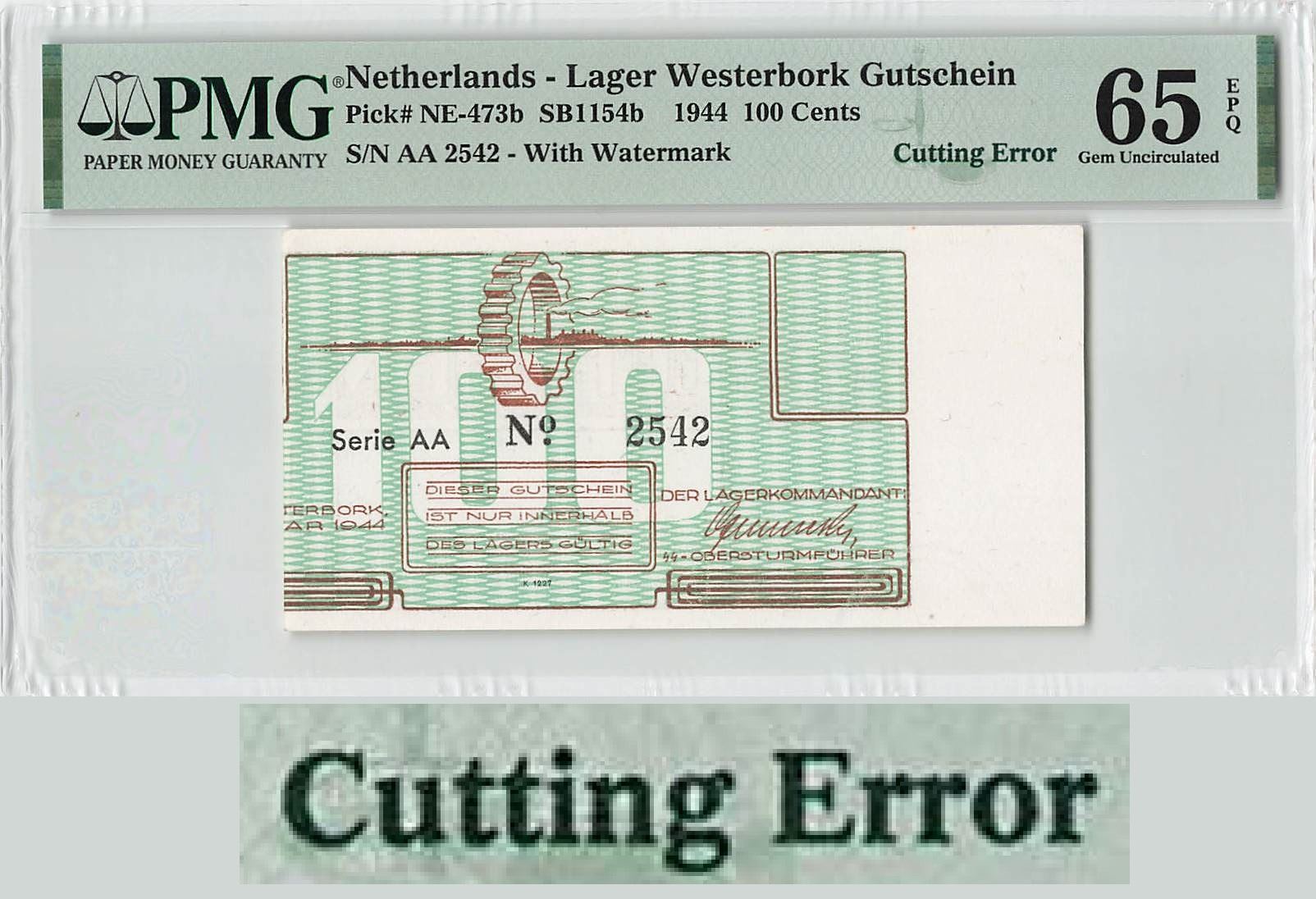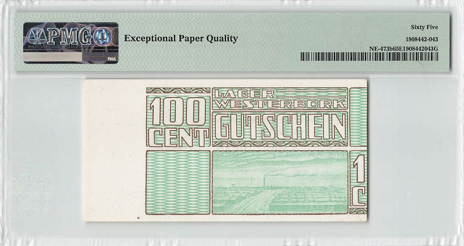 Netherlands 100 Cents 1944 AA with watermark Cutting Error Lager Westerbork Gutschein (transit camp to concentration camps) PMG Gem UNC 65 EPQ