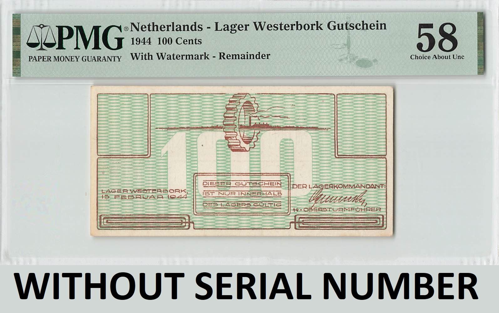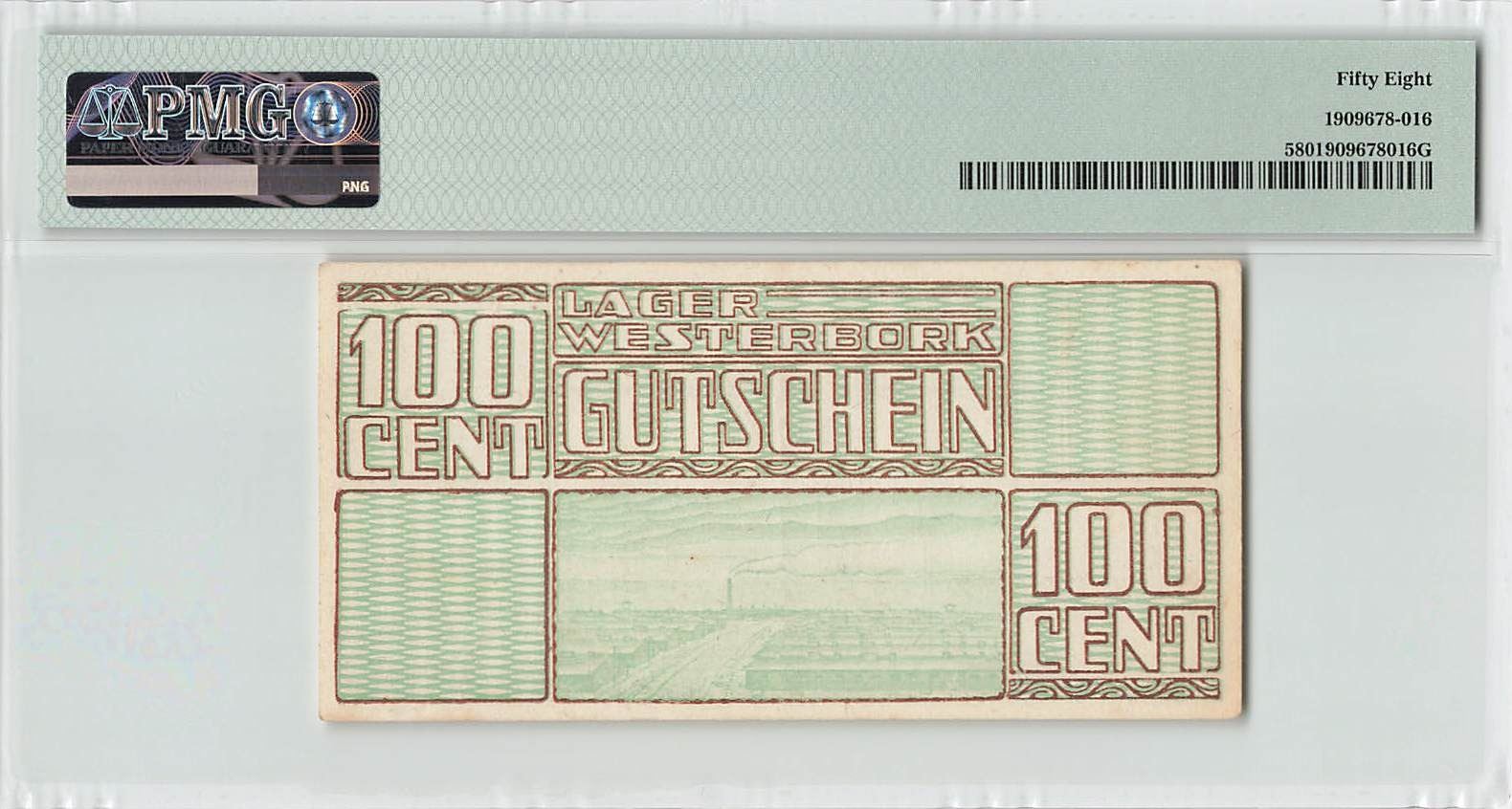 Netherlands 100 Cents 1944 Error / Remainder with Watermark Lager Westerbork Gutschein (transit camp to concentration camps) PMG Choice About UNC 58