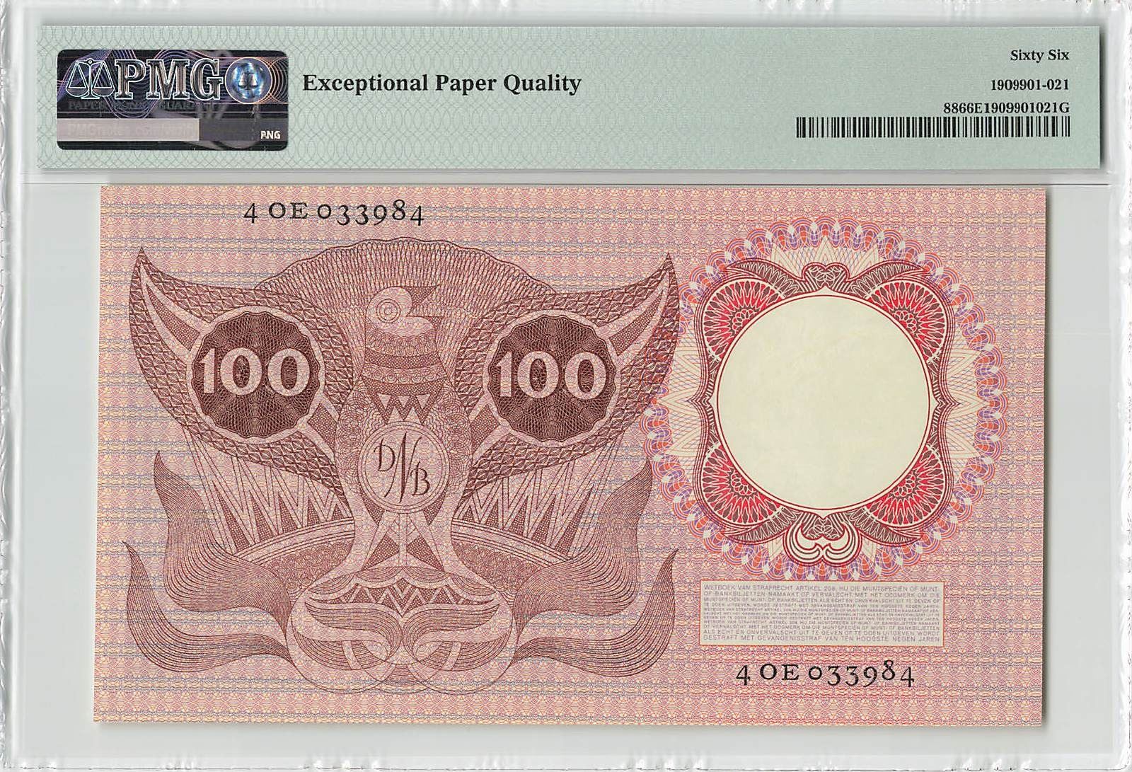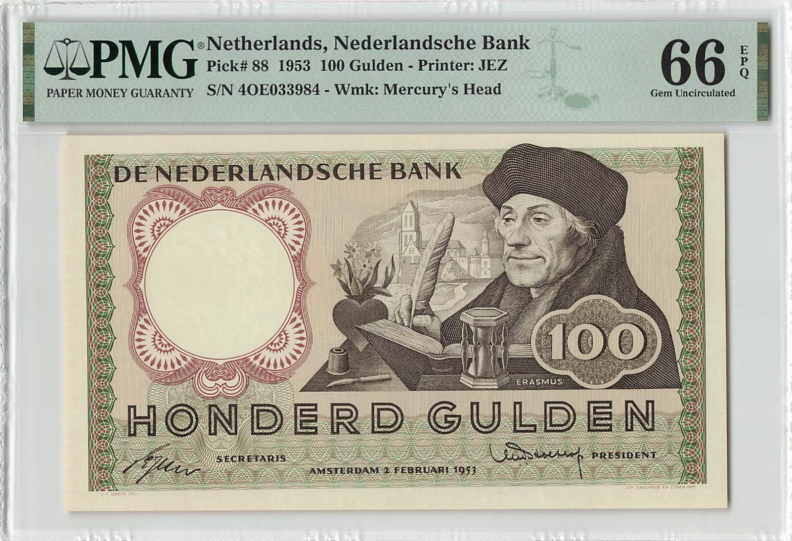 Netherlands 100 Gulden 1953 Erasmus Pick 88 PMG Gem Uncirculated 66 EPQ