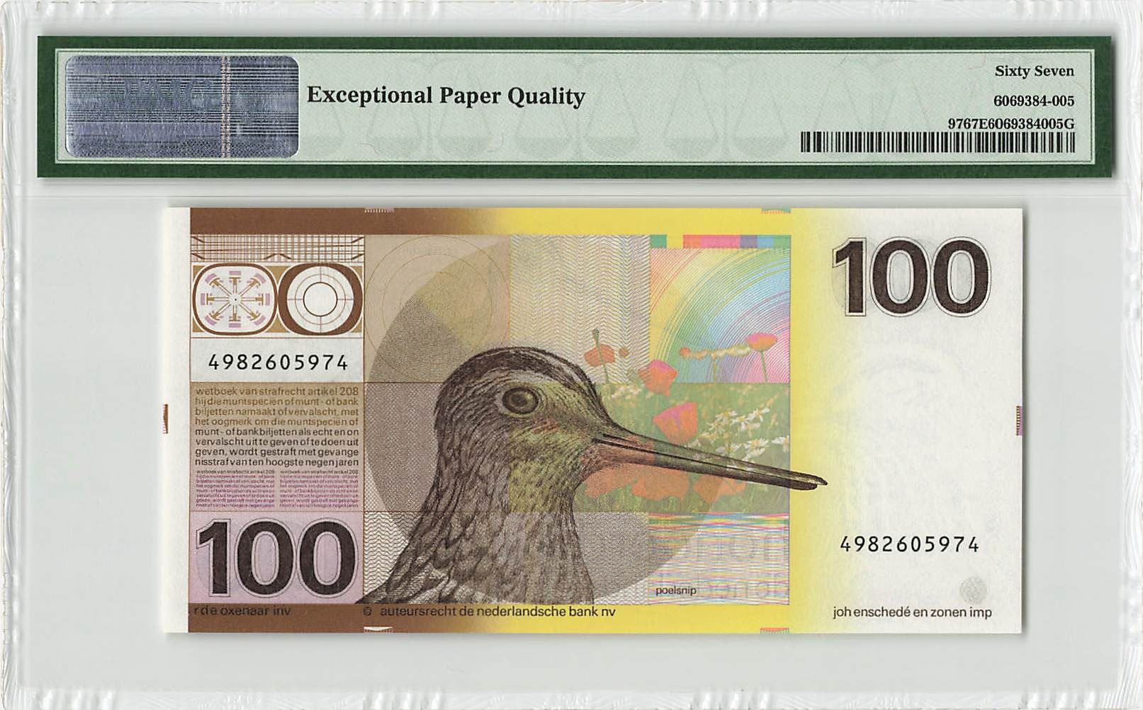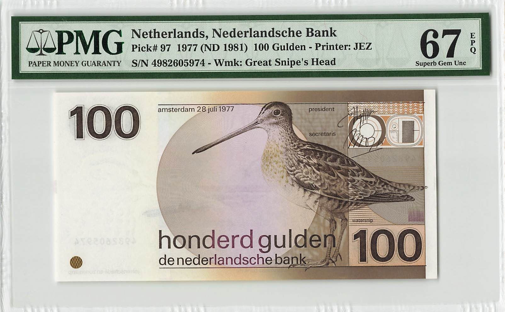 Netherlands 100 Gulden 1977 Snipe Bird Pick 97 PMG Superb Gem UNC 67 EPQ