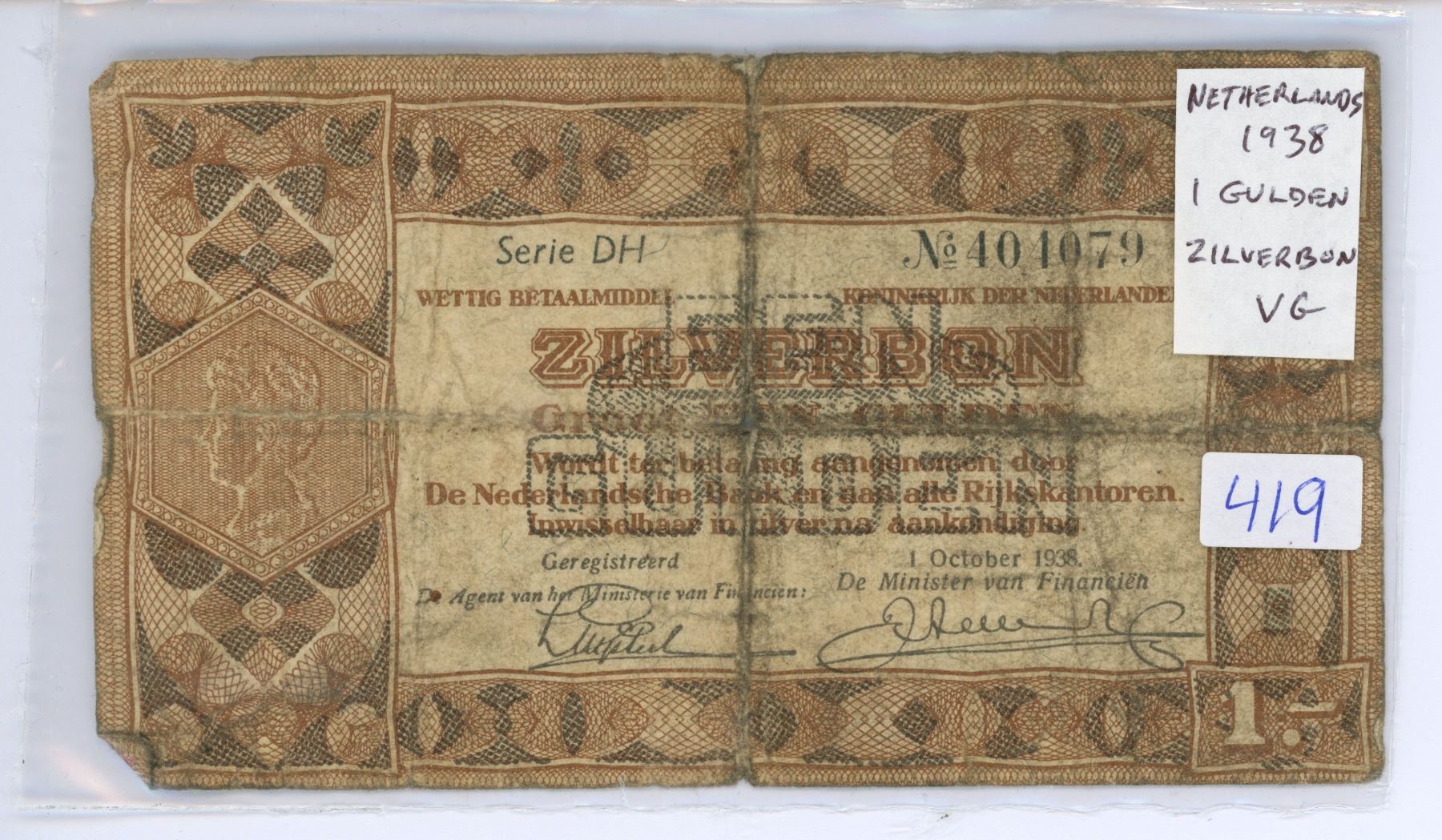 Netherlands. 1938 1 Gulden Zilverbon. At one time, you could take this note to a Dutch bank and demand silver coinage. VG.