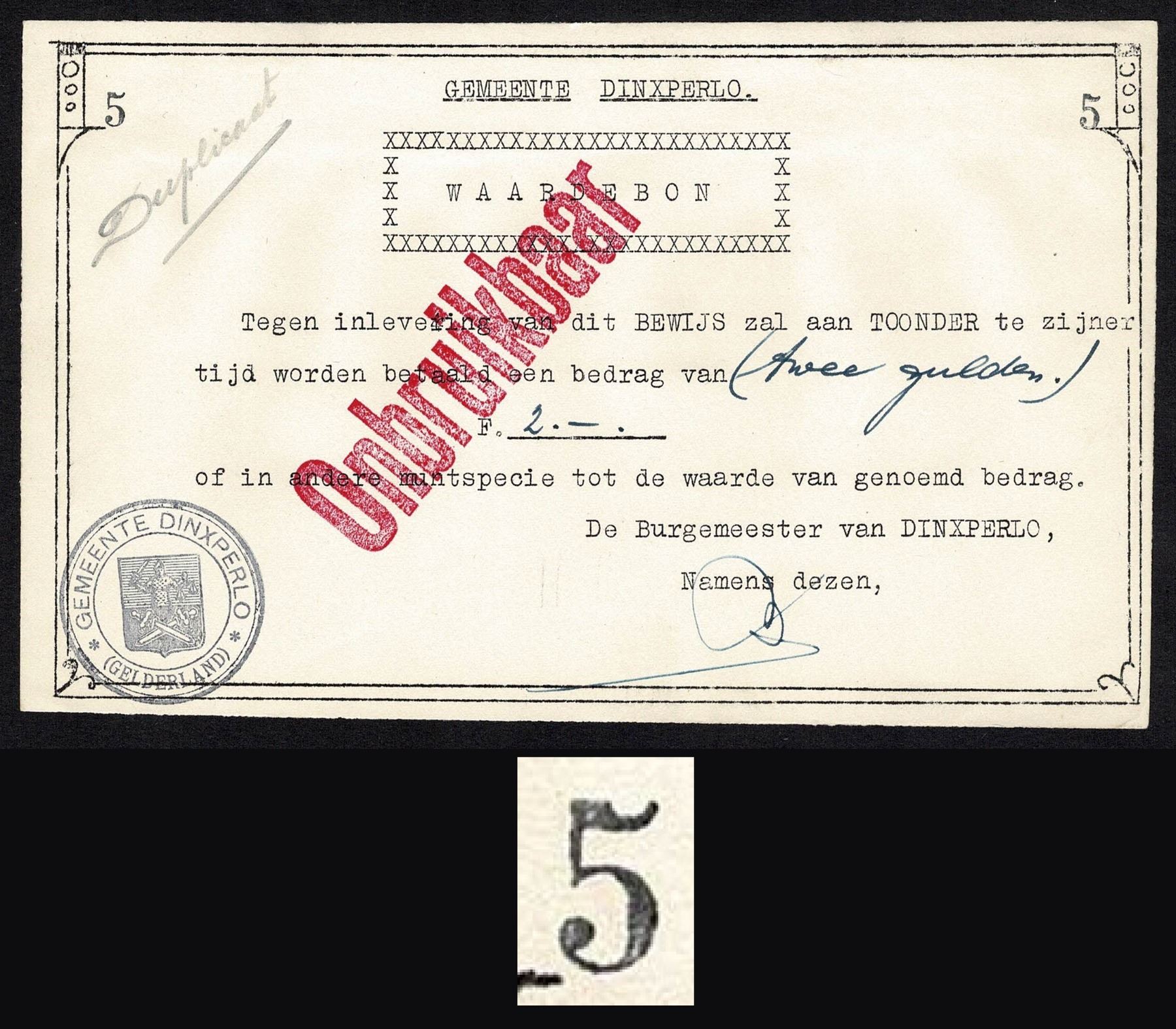 Netherlands 2 Gulden 1940 Dinxperlo Gelderland Duplicaat Noodgeld PR/UNC - EF/UNC Serial number 5! Emergency Money PL315.1 (collection A.M. van de Waal)