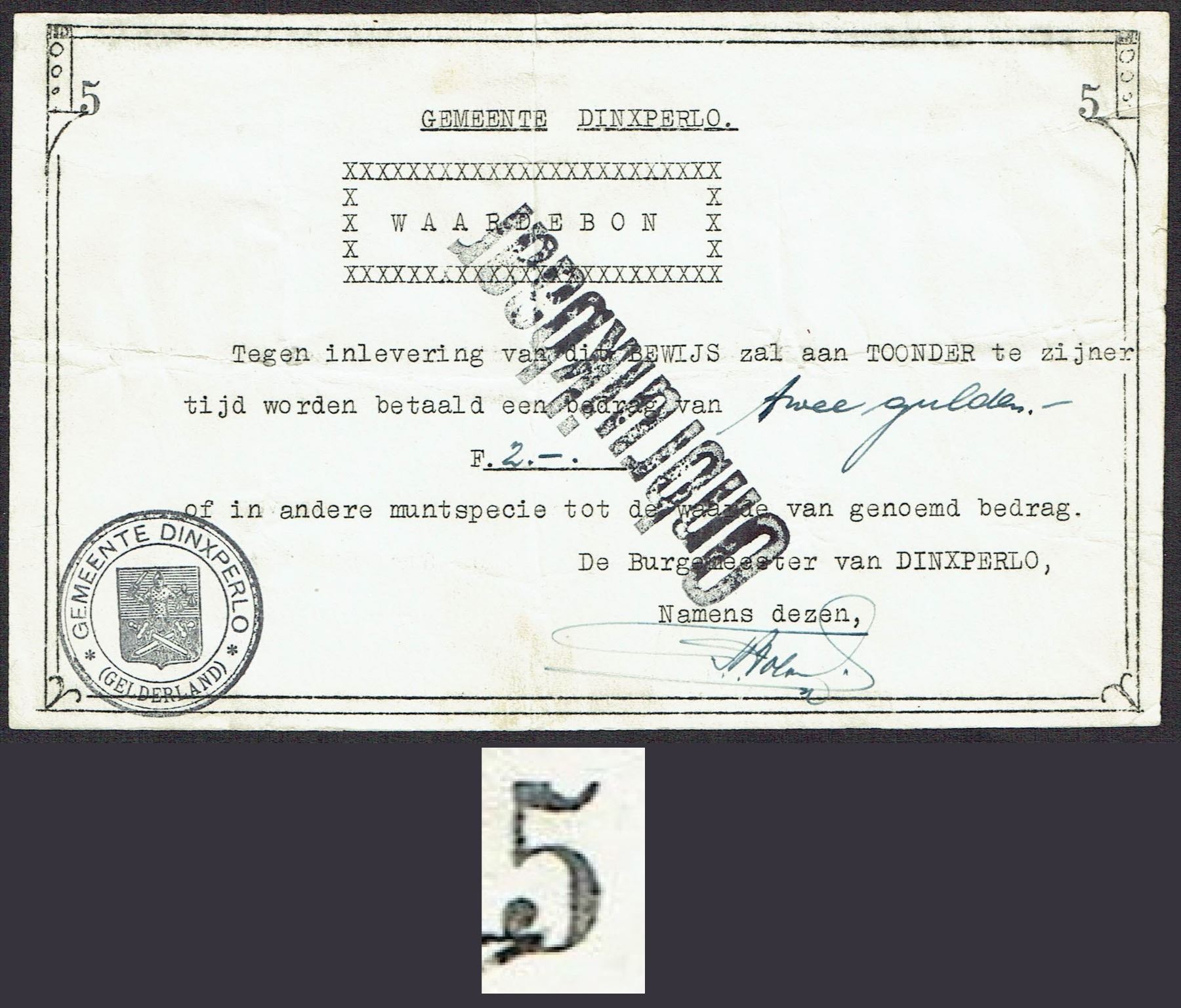 Netherlands 2 Gulden 1940 Dinxperlo Gelderland Noodgeld ZF / VF Serial number 5! Emergency Money PL315.1 (collection A.M. van de Waal)