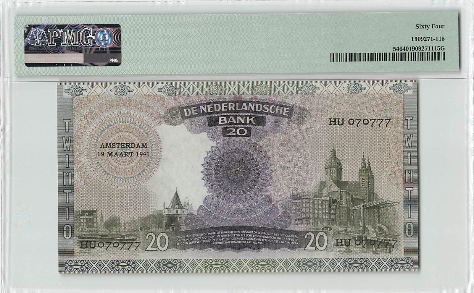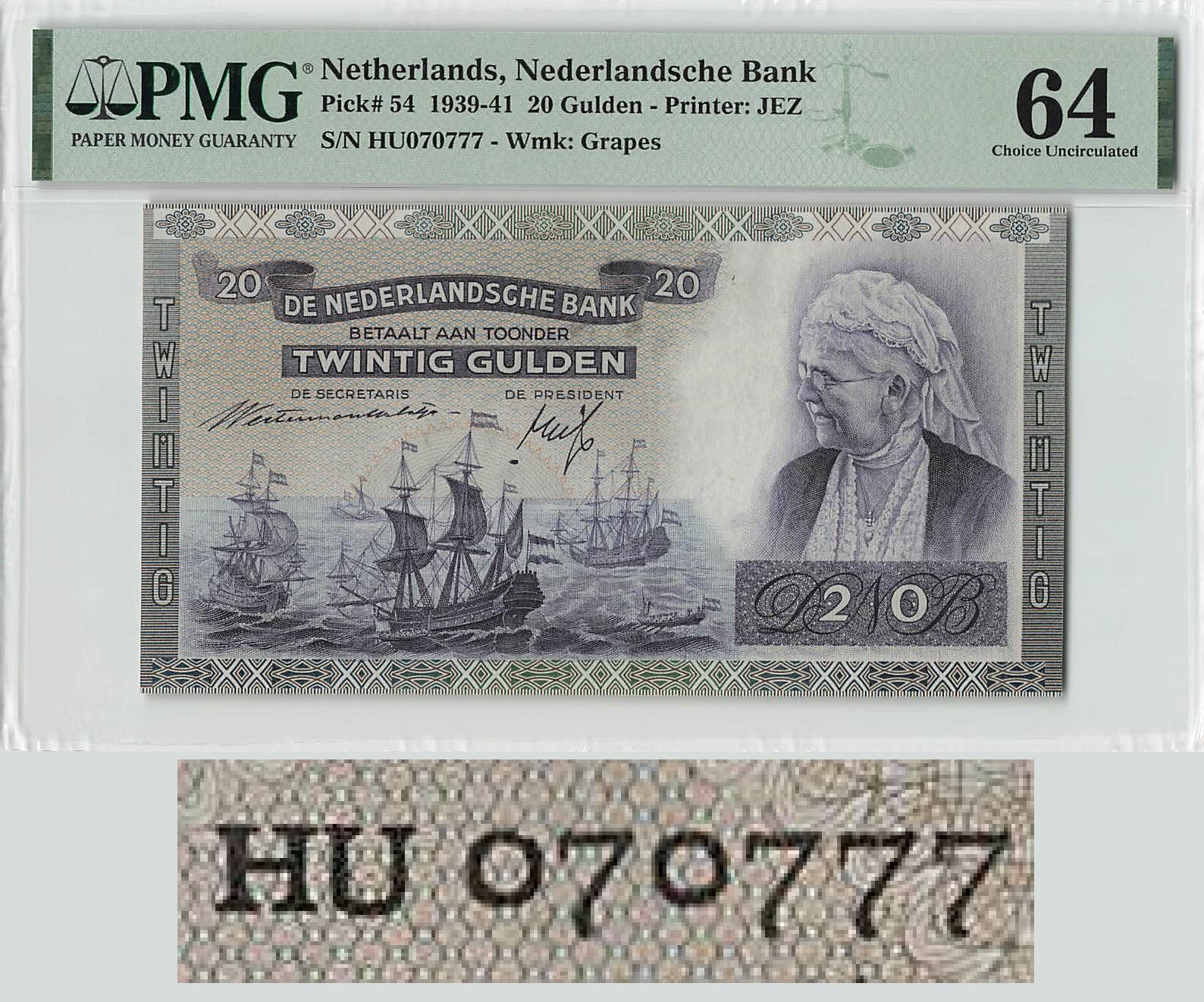 Netherlands 20 Gulden 1941 Fancy Serial 070777 Queen Emma Pick 54 PMG Choice Uncirculated 64