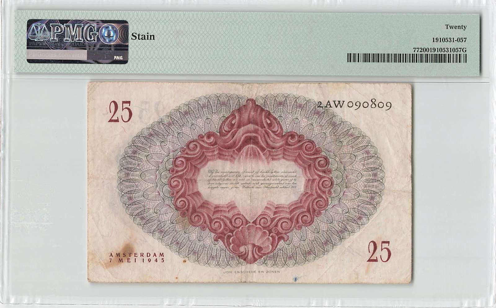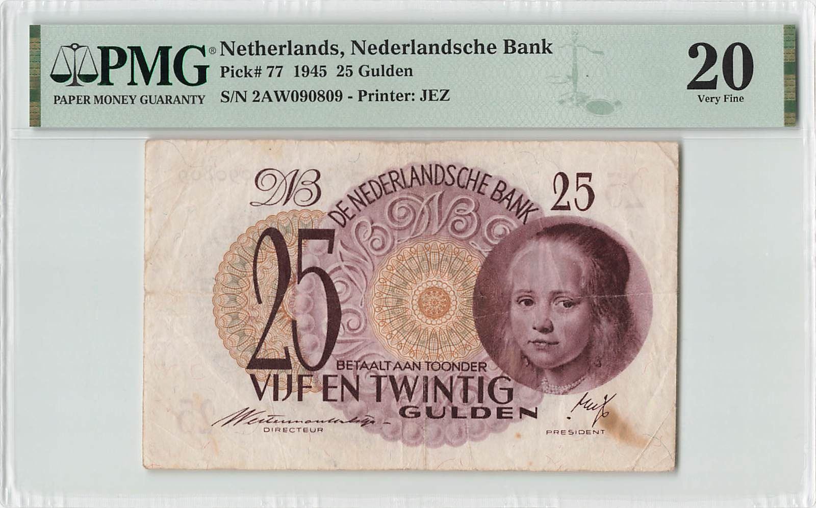 Netherlands 25 Gulden 1945 Girl in Blue Pick 77 PMG Very Fine 20