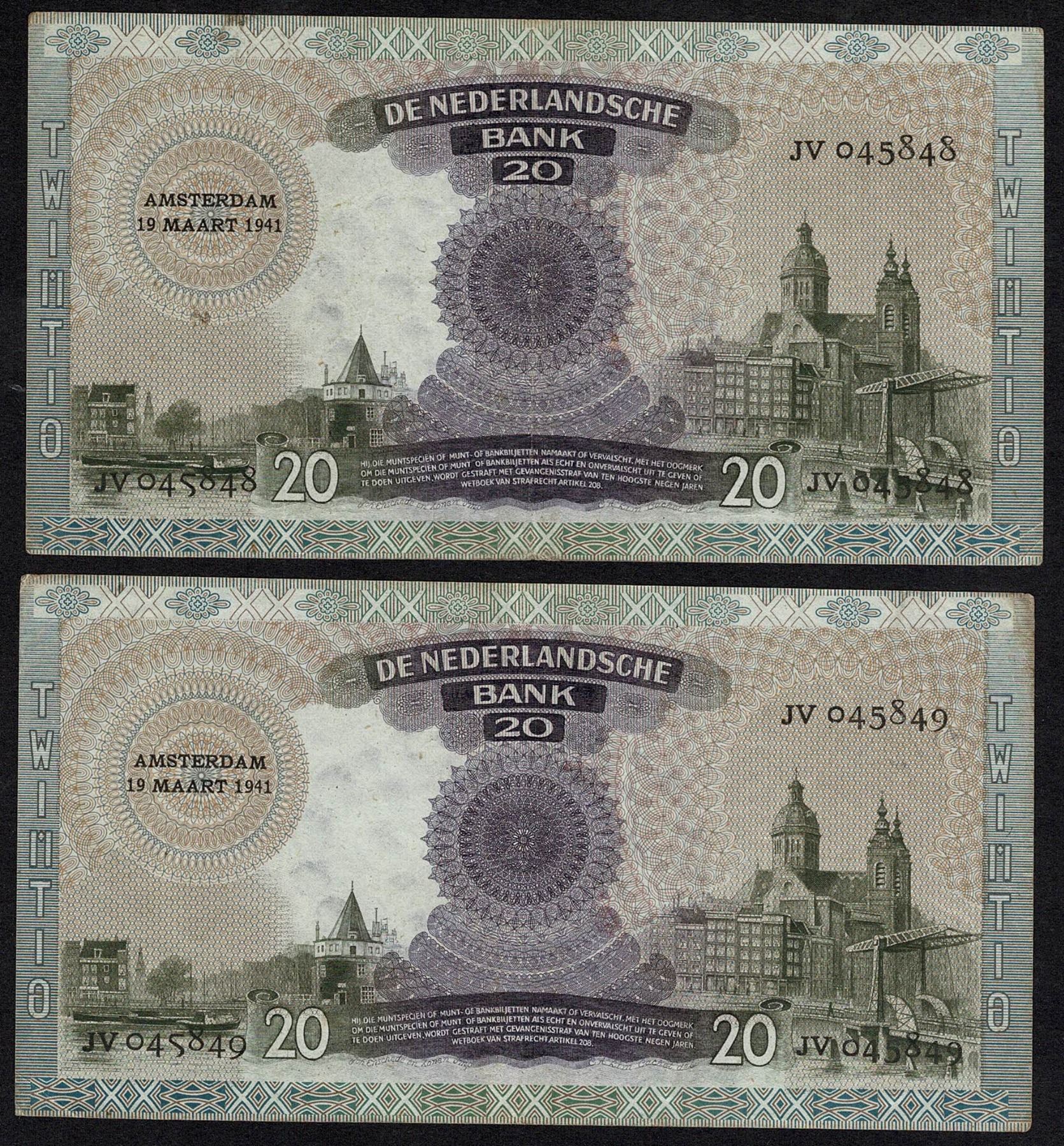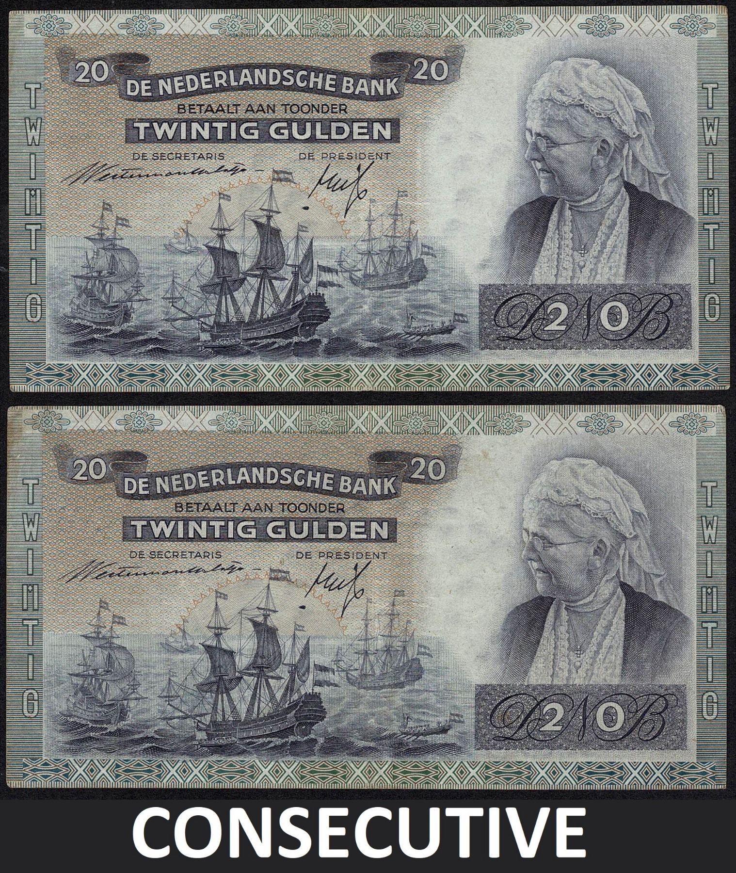 Netherlands 2x Consecutive 20 Gulden 1941 Queen Emma Pick 54