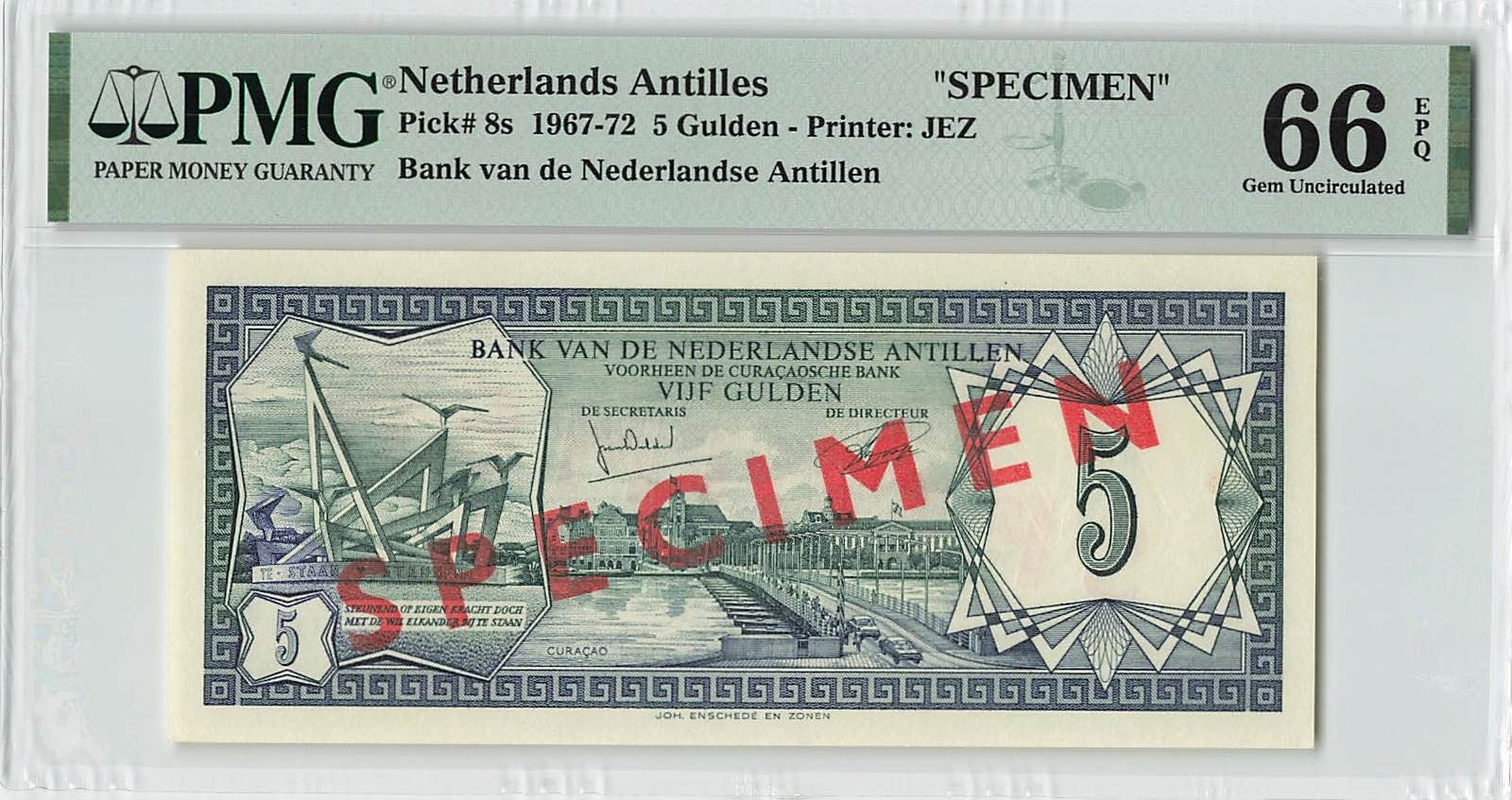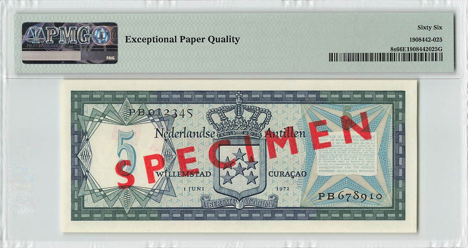 Netherlands Antilles 5 Gulden 1972 Specimen Pick 8s PMG Gem Uncirculated 66 EPQ