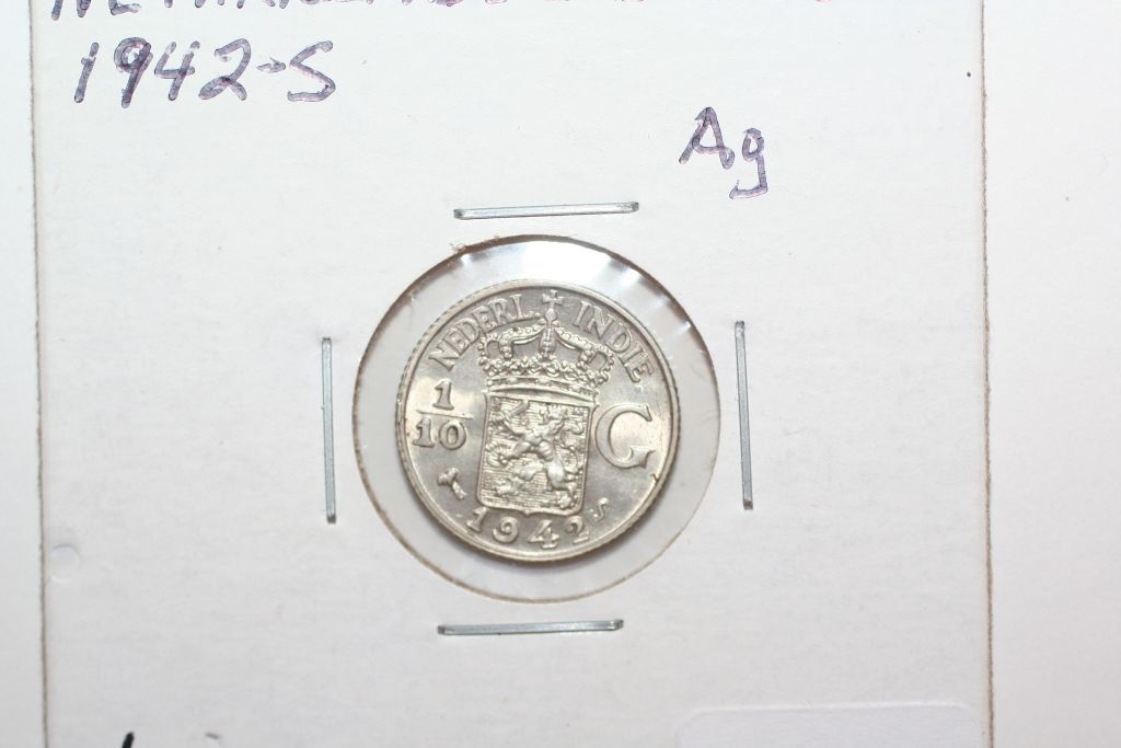 This lot is a 1942-s netherlands east indies 1/10 gulden silver oin