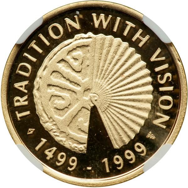 Netherlands Colonies - Aruba. 100 Florin, 1999. Fr-3; KM-19. Weight 0.1944 ounce. Mintage 1,100. Vespucci and ship. Reverse: Aboriginal design. NGC graded Proof 69 Ultra Cameo.