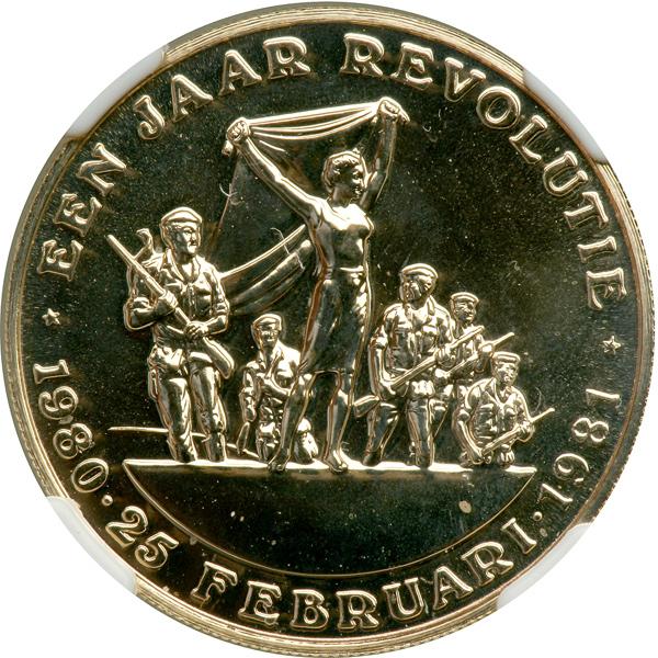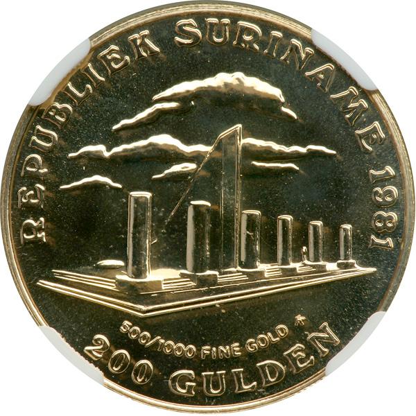 Netherlands Colonies - Surinam. 200 Gulden, 1981. Fr-2; KM-20. Weight 0.1145 ounce. First Anniversary of Revolution. Revolutionaries and monument. NGC graded MS-66.