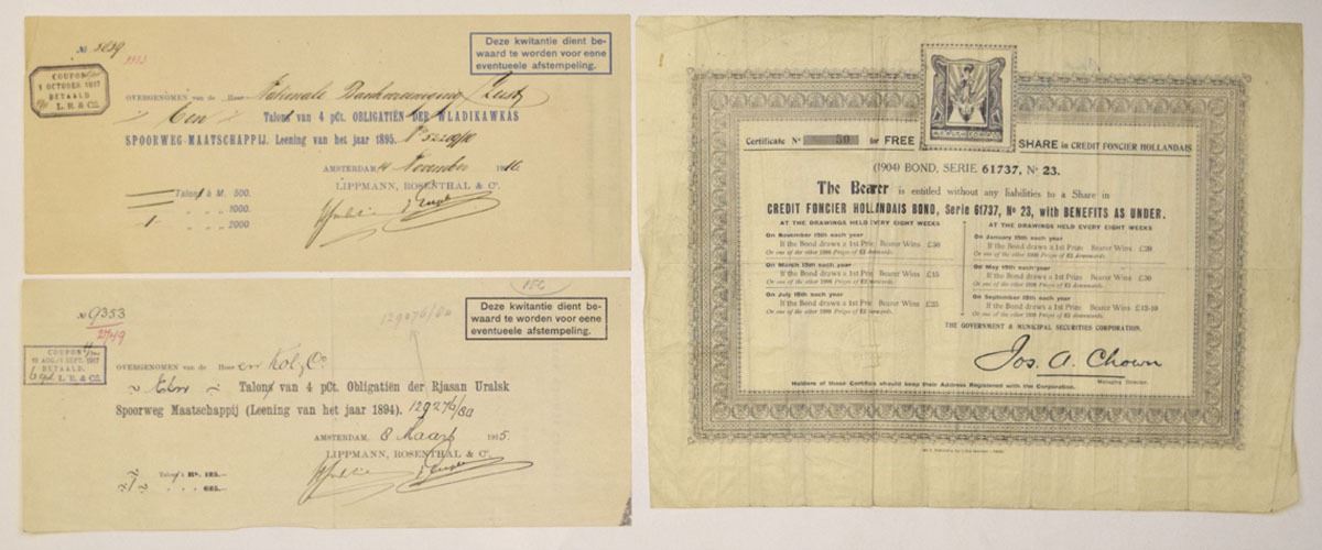 Netherlands, 1894-1904. Lot of 3 Documents, Includes: 1894, Riazan–Uralsk Railway and 1895, Vladikavkaz Railway loans printed in Dutch; 1904, Credit Foncier Hallandias Bond printed in English. All are in Fine to VF condition. (3). Sold "AS IS" no returns accepted.