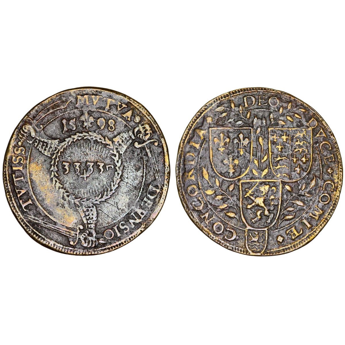 Rev: Three arms holding swords, from central tablet reading 3333 (in error for Jehovah), MVTA DEFENSIO.