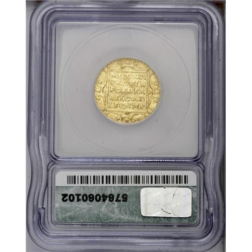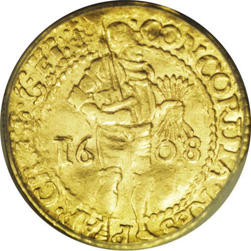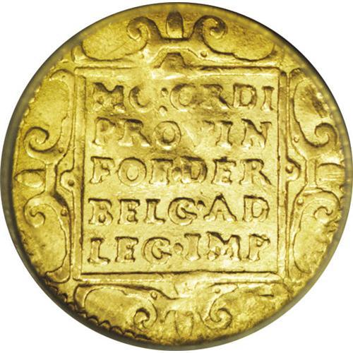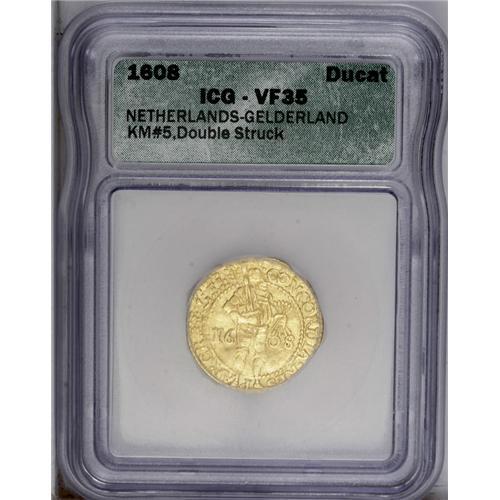 <B>1608 Netherlands, Gelderland Gold Ducat--Double Struck--VF35 ICG. </B></I> KM-5. The gold ducat is a classic trade coin, and as an early dated gold type coin, this would be an affordable piece. However, since the obverse is double struck, with the effect strongest on the left side obverse legend, this coin will not sell at a reasonable level for collectors of this type. The reverse does not exhibit doubling, which suggests that the anvil (reverse) die was stationary between strikes, while the obverse die shifted slightly clockwise.<BR><I>From The Henderson Collection of U.S. Gold Errors.</B></I>