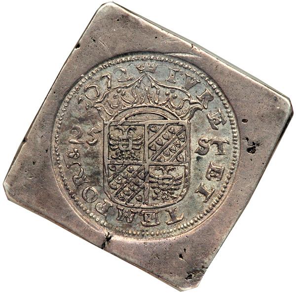 Netherlands - Groningen. 25 Stuivers Klippe, 1672. Mailliet-6; KM-26. Siege coinage. Crest dividing value on uniface rectangular planchet. This issue struck while the city was besieged by the Bishops of Munster and Cologne. Natural edge crack. NGC graded AU-50.