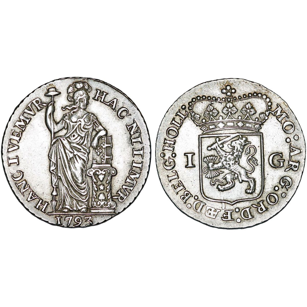Obv: A goddess holding a spear with hat on top next to the small column, date below.