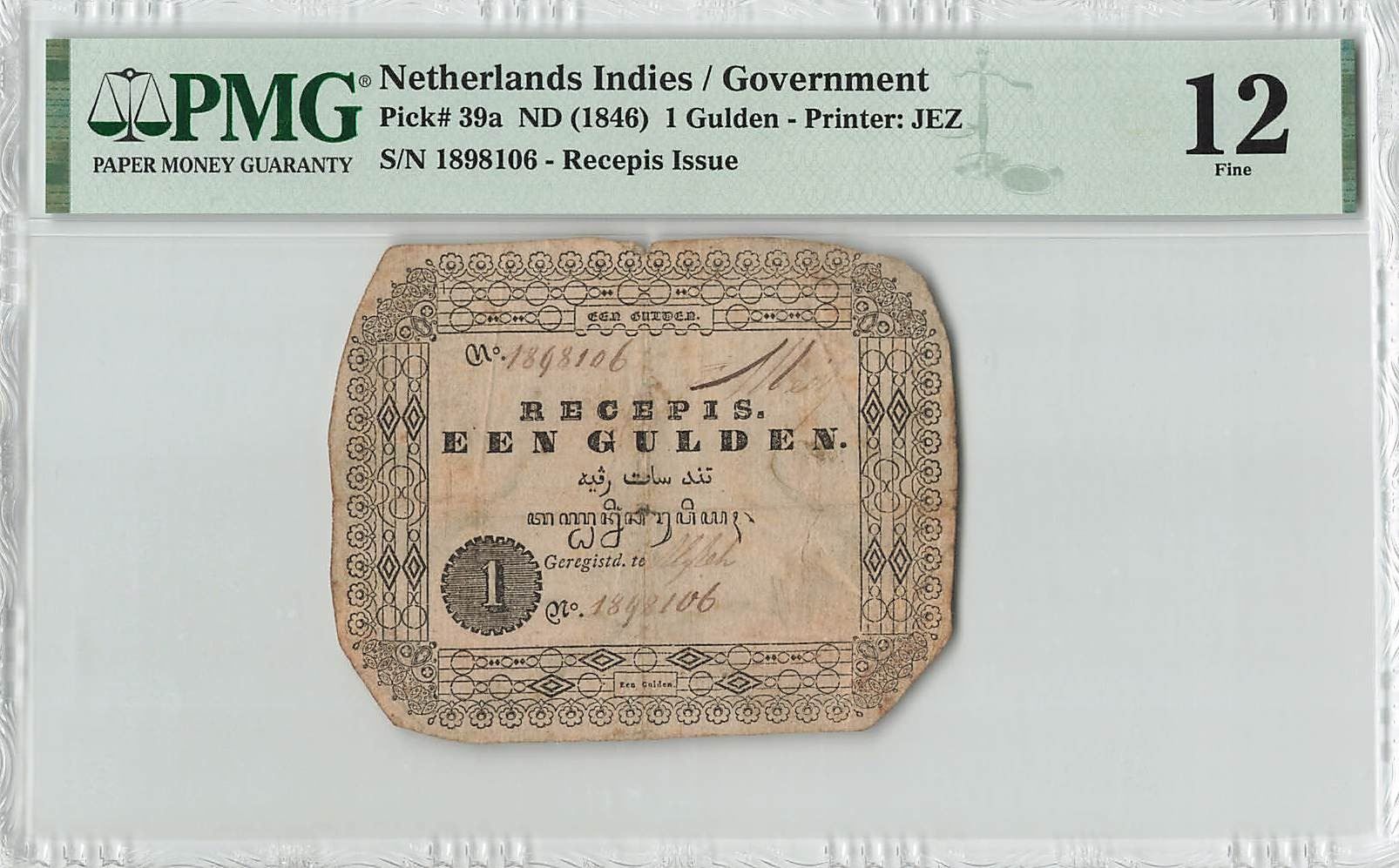 Netherlands Indies 1 Gulden 1846 Recepis Issue JEZ Pick 39a PMG Fine 12