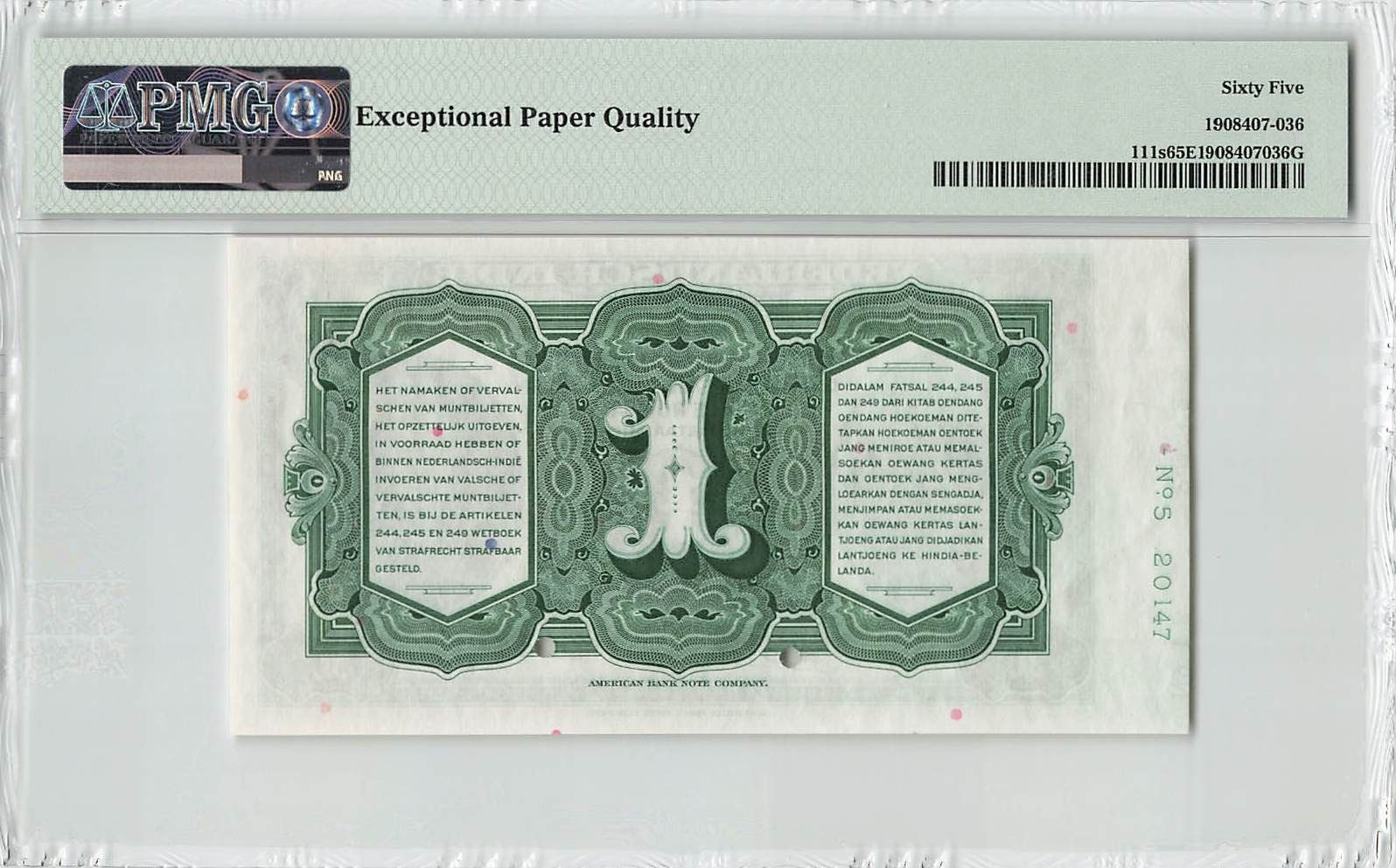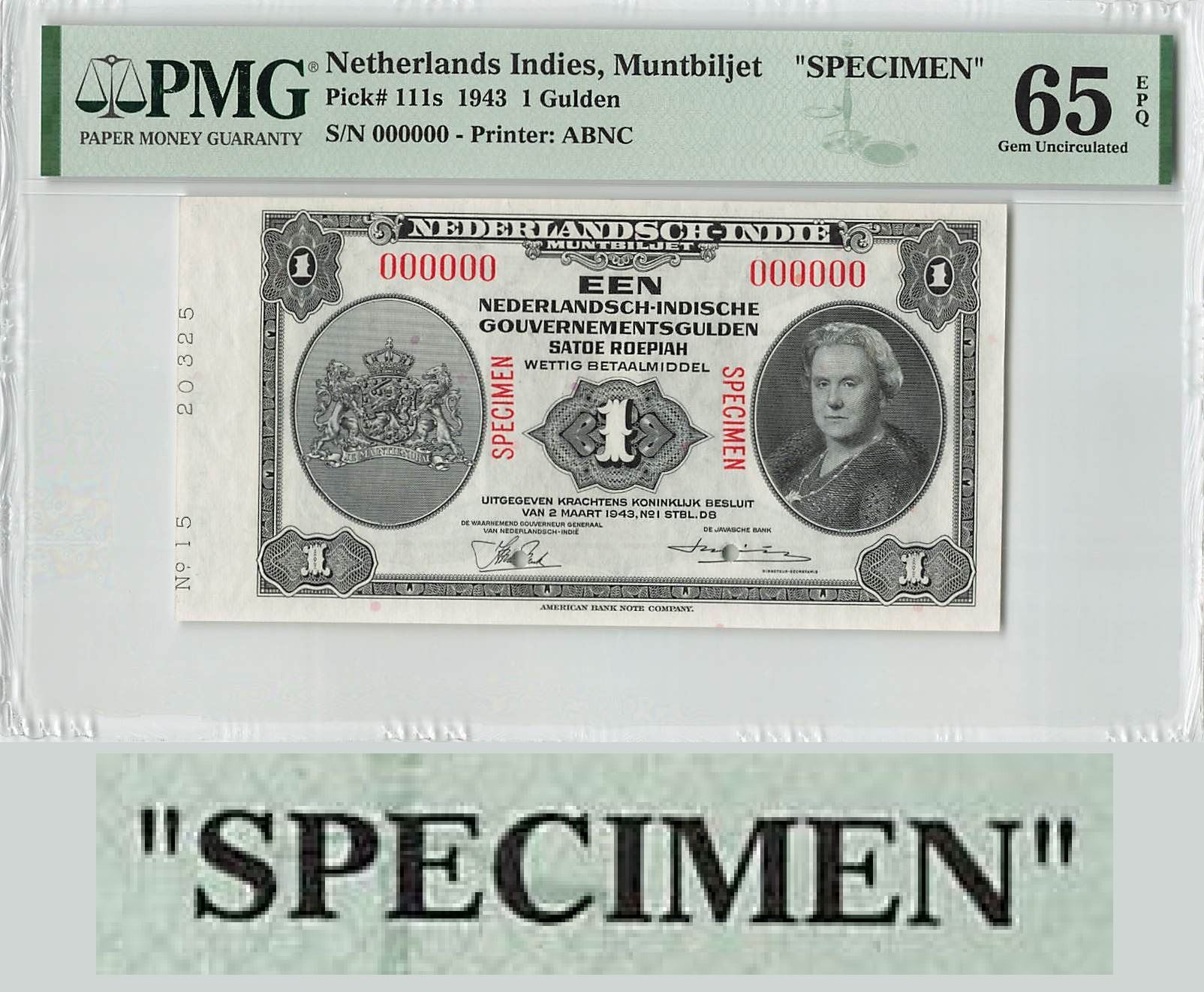 Netherlands Indies 1 Gulden 1943 Specimen Pick 111s PMG Gem UNC 65 EPQ (special variant with extra paper and sheet number)