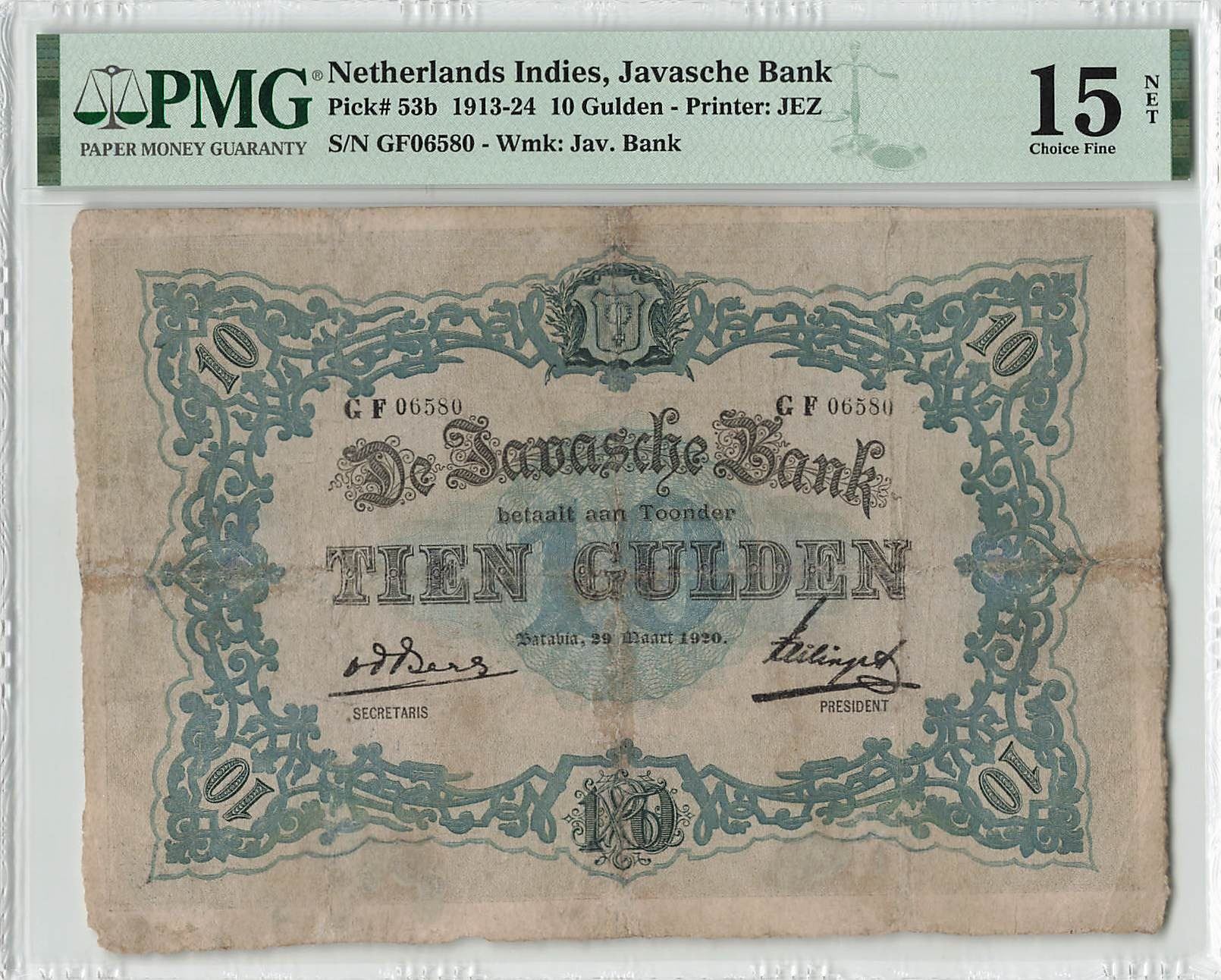 Netherlands Indies 10 Gulden 1920 Pick 53b PMG Choice Fine 15