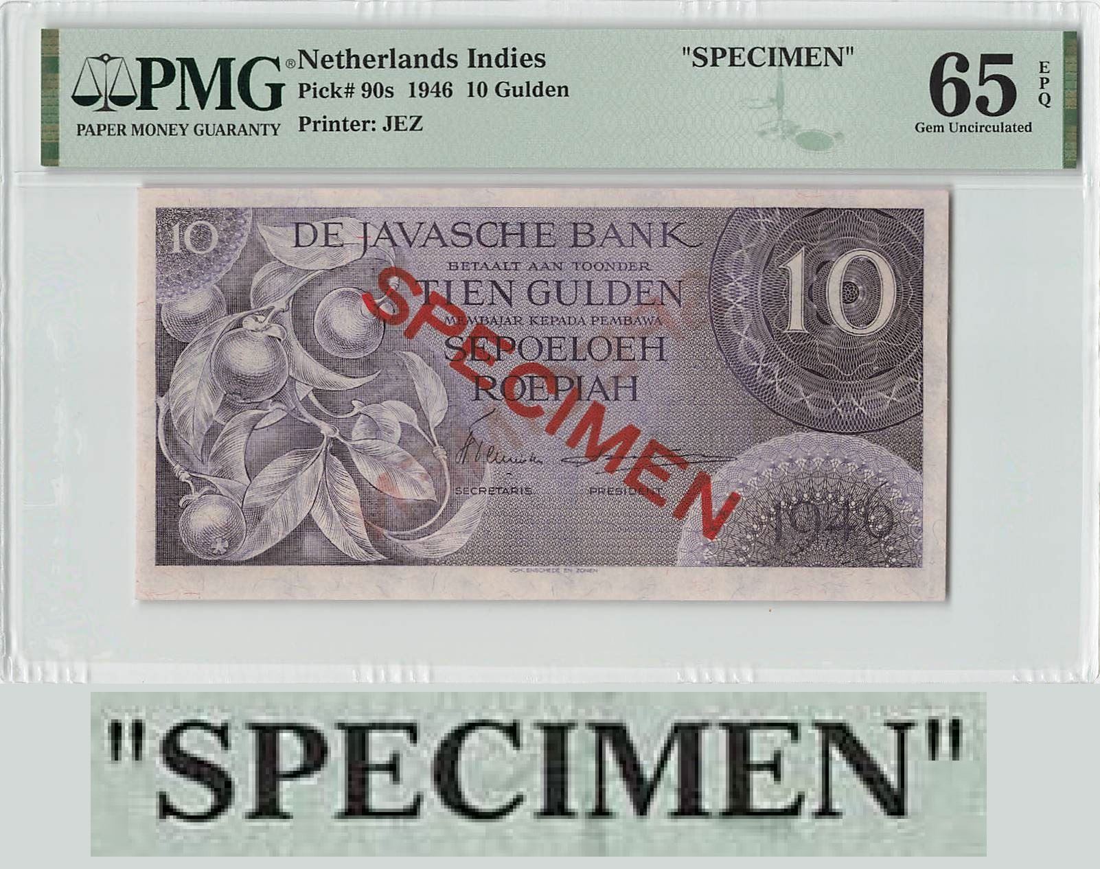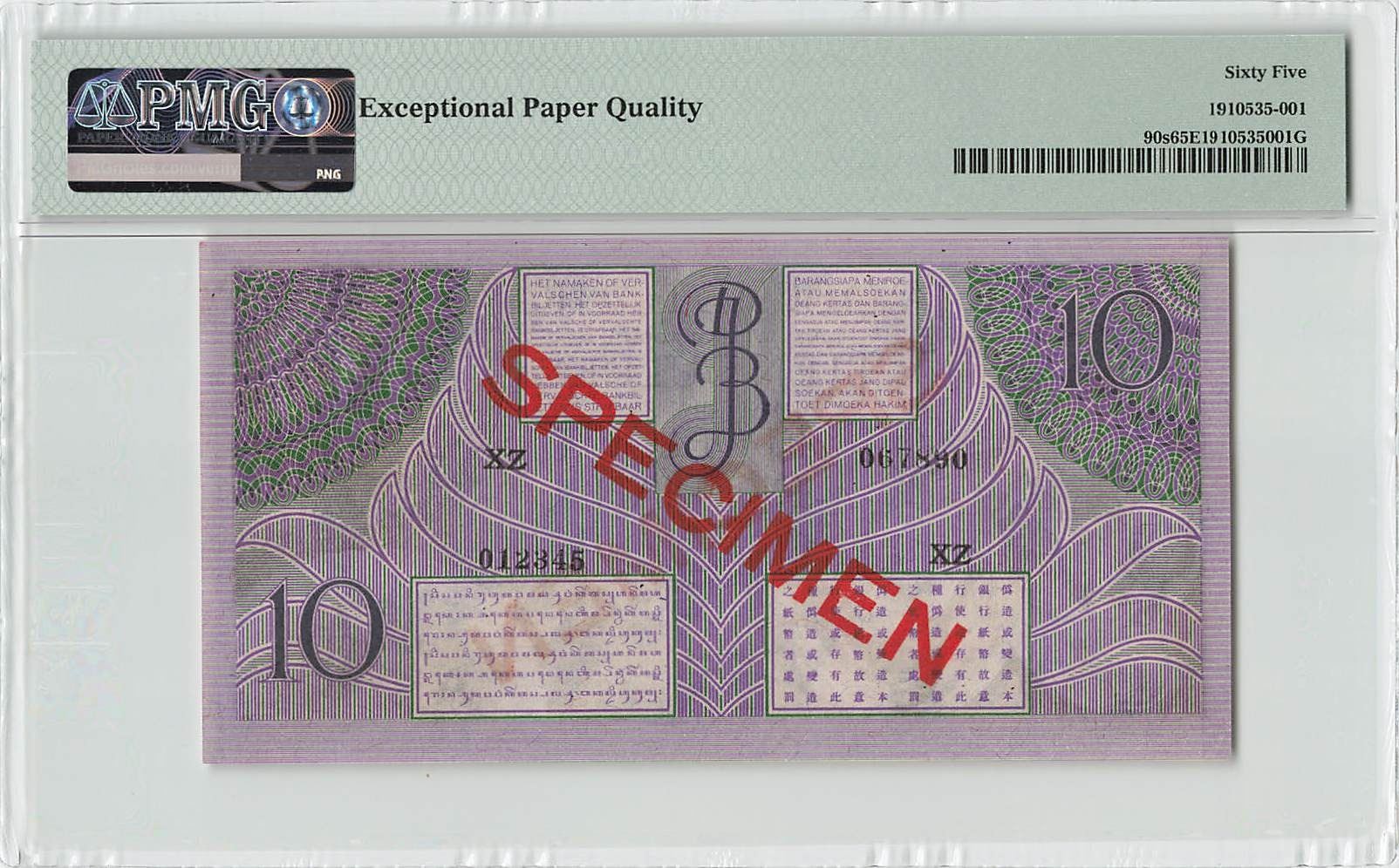 Netherlands Indies 10 Gulden 1946 Specimen JEZ Pick 90s PMG Gem Uncirculated 65 EPQ