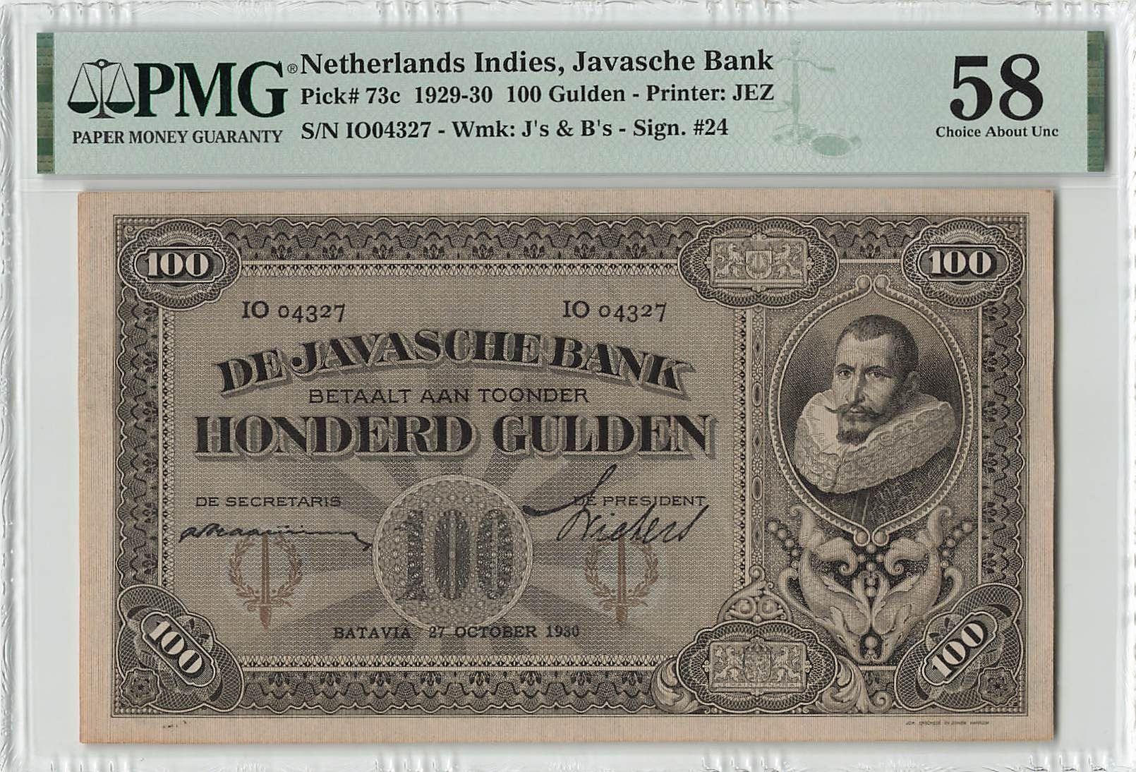 Netherlands Indies 100 Gulden 1930 J.P. Coen JEZ Pick 73c PMG Choice About UNC 58