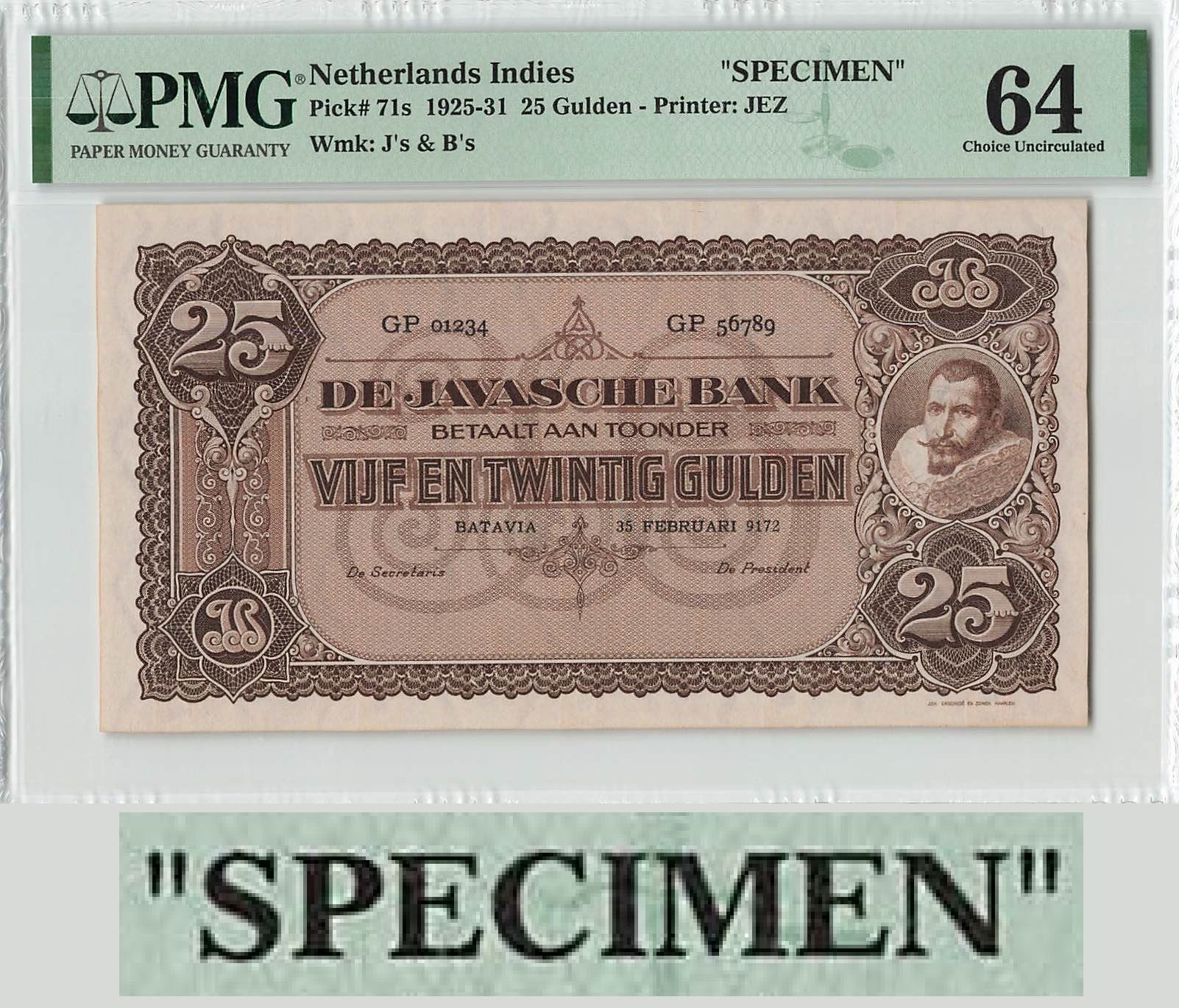Netherlands Indies 25 Gulden 1925 Specimen J.P Coen Pick 71s PMG Choice Uncirculated 64