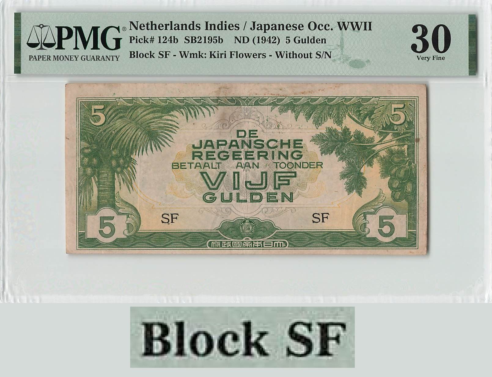 Netherlands Indies 5 Gulden 1942 Block SF Pick 124b PMG Very Fine 30