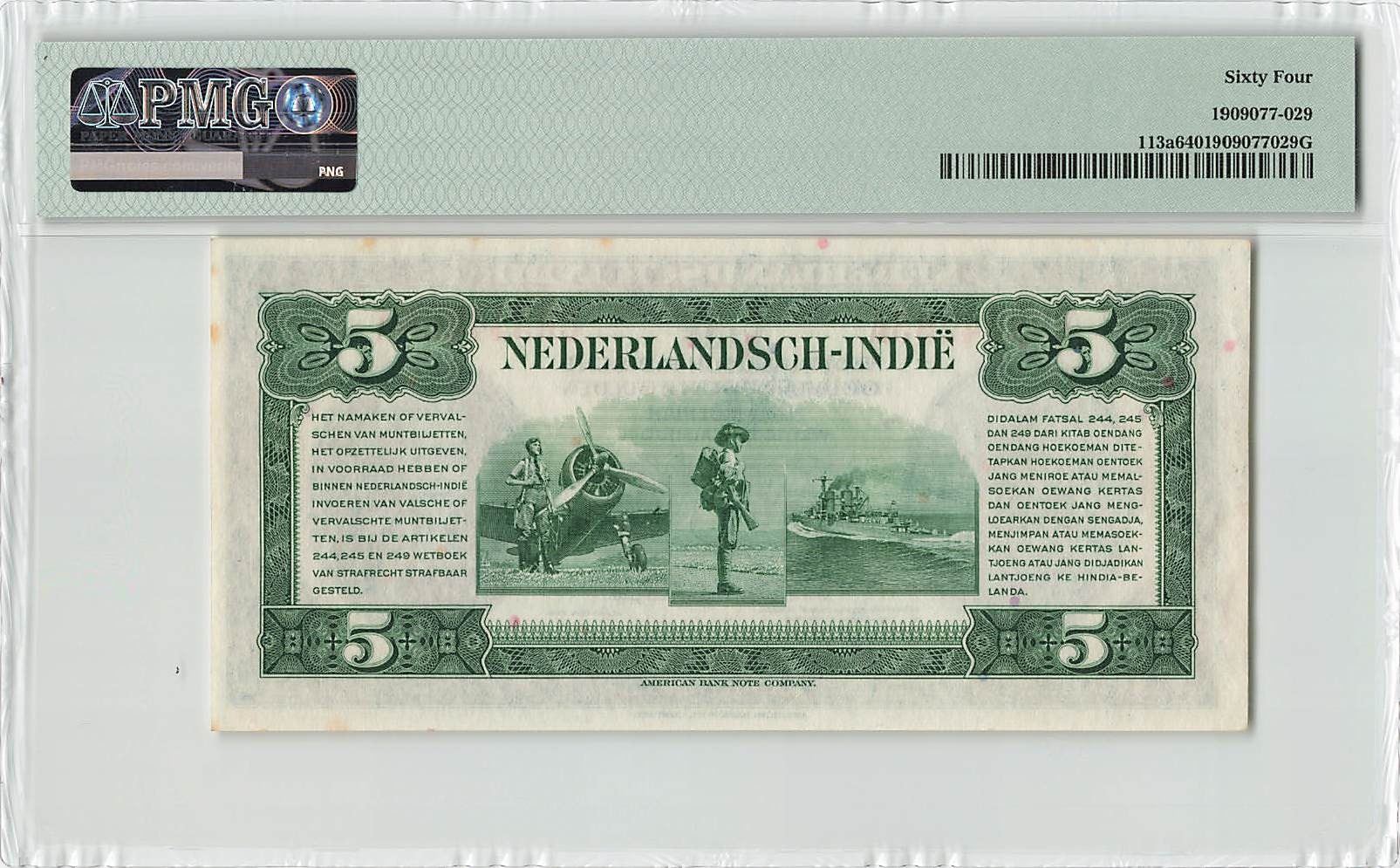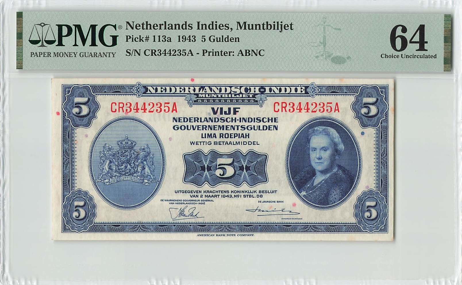 Netherlands Indies 5 Gulden 1943 ABNC Pick 113a PMG Choice UNC 64