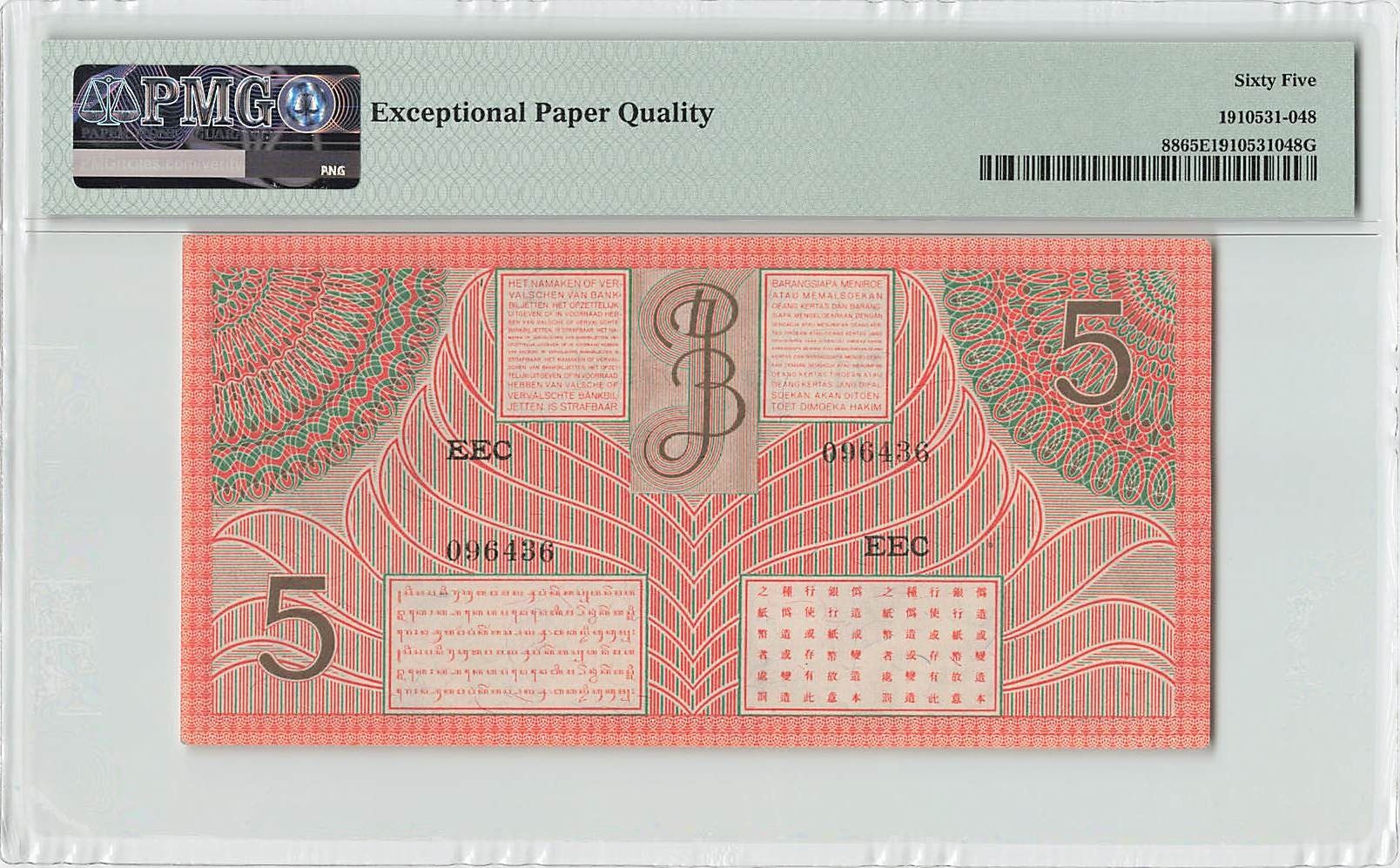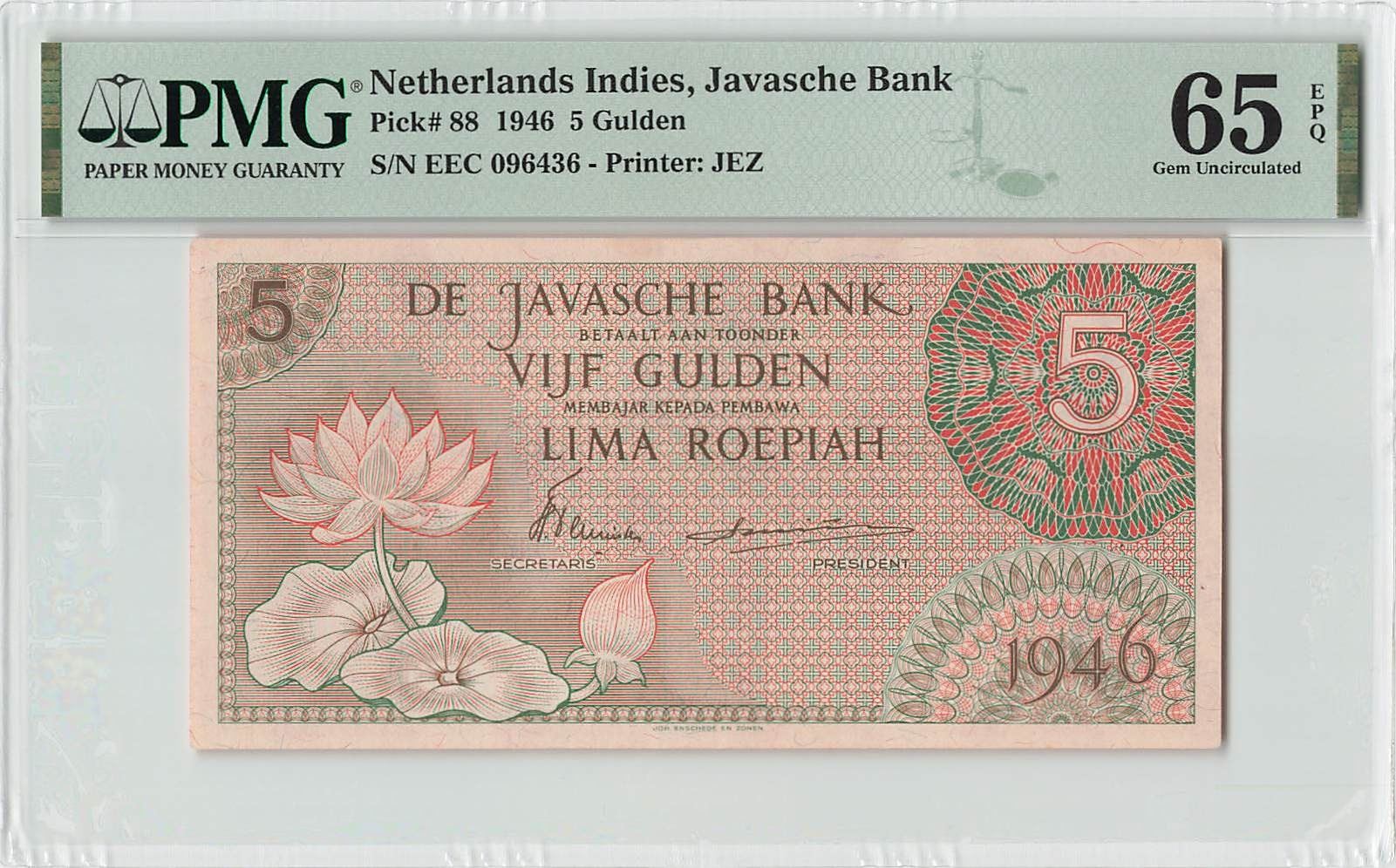 Netherlands Indies 5 Gulden 1946 JEZ Pick 88 PMG Gem Uncirculated 65 EPQ