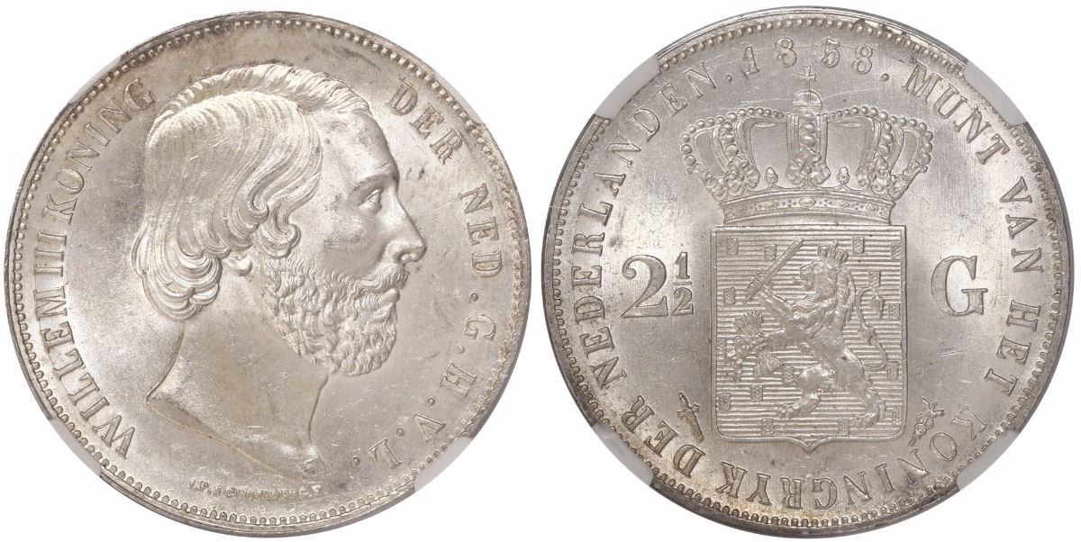 Netherlands (Kingdom), 2-1/2 gulden, Willem III, 1858, encapsulated NGC MS 64, finest known in NGC c