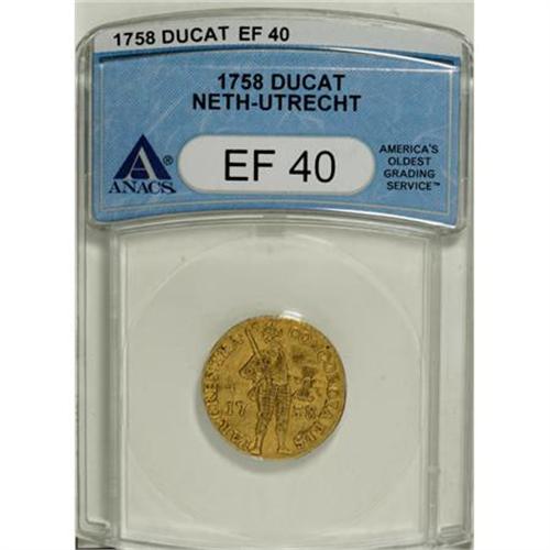 <B>Utrecht. Gold Trade Ducat 1758,</B></I> KM7, XF40 ANACS, light traces of luster.<BR><BR><b>Shipping:</b> Coins & Currency (<a target="_blank" href="http://www.heritageauctions.com/common/shipping.php">view shipping information</a>)