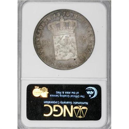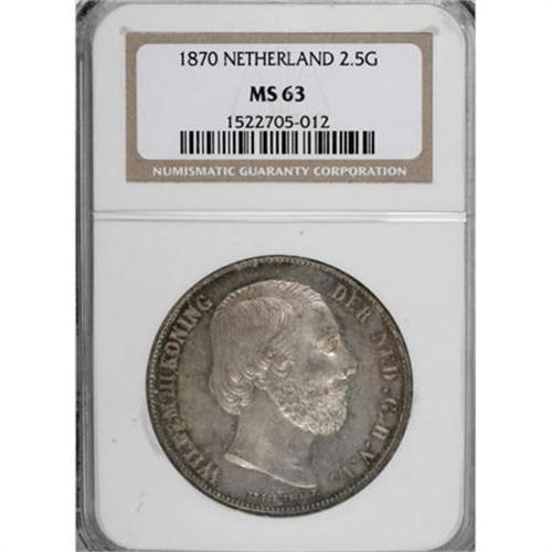 <B>William III 2 1/2 Gulden 1870,</B></I> KM82, MS63 NGC, very attractive patina with blue-green and gold highlights. Mint state examples of this type are underrated in the SCWC.<BR><BR><b>Shipping:</b> Coins & Currency (<a target="_blank" href="http://www.heritageauctions.com/common/shipping.php">view shipping information</a>)