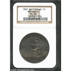 <TABLE cellSpacing=0 cellPadding=0 width="100%" bgColor=#000000 border=0><TBODY> <TR><TD width="100%"><TABLE cellSpacing=1 cellPadding=3 width="100%" border=0><TBODY><TR><TD width="100%" bgColor=#79735c><FONT face=arial color=#ffffff size=3><B>Description</B> </FONT></TD></TR><TR><TD width="100%" bgColor=#ffffff><FONT face=arial size=2><B>Neuchatel 5 Francs 1863,</B></I> KM-S7, MS62 NGC, deeply toned and very attractive. </FONT></TD></TR></TBODY></TABLE></TD></TR></TBODY></TABLE><BR><A name=PricesRealized></A><TABLE cellSpacing=0 cellPadding=0 width="100%" bgColor=#000000 border=0><TBODY><TR><TD width="100%"><TABLE cellSpacing=1 cellPadding=3 width="100%" border=0><TBODY><TR><TD width="100%" bgColor=#79735c><A name=PR><FONT face=arial color=#ffffff size=3><B>Previous Prices from Heritage Auctions</B> </FONT></A></TD></TR><TR><TD bgColor=#f6f6ed>No Prior Data Recorded </TD></TR><TR><TD bgColor=#ffffff><FONT face=arial size=1 ?>PLEASE NOTE: All prices realized reflect the final hammer price PLUS the buyer's premium in auctions that charge a buyer's premium. Each item has a notation at the top of the listing indicating whether that lot included a buyer's premium. Example: A item that sells with a final hammer price of $100 and a 20% buyer's premium will display with a price realized of $120. All information listed is intended to be as accurate as possible, but errors are possible. Please use this guide carefully and inform us of any inaccuracies. </FONT></TD></TR></TBODY></TABLE></TD></TR></TBODY></TABLE><BR><TABLE cellSpacing=0 cellPadding=0 width="100%" bgColor=#000000 border=0><TBODY><TR><TD width="100%"><TABLE cellSpacing=1 cellPadding=3 width="100%" border=0><TBODY><TR><TD width="100%" bgColor=#79735c colSpan=6><FONT face=arial color=#ffffff size=3><B>Price Guide*</B> </FONT></TD></TR><TR bgColor=#f6f6ed><TD align=middle><B>Grade</B> </TD><TD align=middle><B>Coin World<BR>(Trends)</B> </TD><TD align=middle><B>Numismedia<BR>Retail</B> </TD><TD align=middle><B>Numismedia<BR>Wholesale</B> </TD><TD align=middle><B>Coin<BR>Universe</B> </TD><TD align=middle><B>Heritage<BR>Value Index</B> </TD></TR><TR bgColor=#ffffff><TD colSpan=6><FONT size=1>*All information listed is intended to be as accurate as possible, but errors are possible. No item may be returned or refused based on this information which is provided as a service to our customers. You should contact each pricing source directly to determine the accuracy of this information. </FONT></TD></TR></TBODY></TABLE></TD></TR></TBODY></TABLE><BR><TABLE cellSpacing=0 cellPadding=0 width="100%" bgColor=#000000 border=0><TBODY><TR><TD width="100%"><TABLE cellSpacing=1 cellPadding=3 width="100%" border=0><TBODY><TR><TD width="100%" bgColor=#79735c><FONT face=arial color=#ffffff size=3><B>Population Guide</B> </FONT></TD></TR><TR bgColor=#ffffff> Important notice: Heritage usually auctions material at the rate of 200-250 lots per hour. On some occasions eBay Live bid software or the Internet may not be able to keep up with the pace of the auction. We recommend placing a realistic absentee bid now as insurance to avoid disappointment. Occasionally the auctioneer may eliminate or reject an eBay Live bid, and the auctioneer may also reopen a lot after the close of the eBay live bidding (usually because we missed an audience bid), and may reject your bid even if it shows you as the winning bidder. By bidding via eBay Live, you agree that Heritage may award the lot to another bidder at its sole discretion under the circumstances described above or any other reasonable circumstances. Also please note that all Heritage lots purchased through eBay Live carry a 20% Buyer's Premium. Please make sure you read the Terms and Conditions before you bid.</TD></TR></TBODY></TABLE></TD></TR></TBODY></TABLE>
