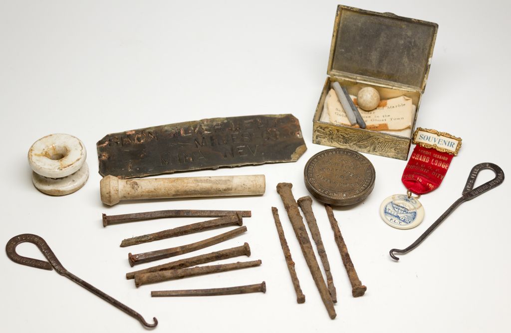 Lot of 7. 1) Slate pencils and marble found under the school house in Aurora, NV. They are contained in a 2 x 3” Chicago World’s Fair metal box depicting the Hall of Science on the top. 2) Corporate Seal plate of the Missouri-Bullfrog Mining & Mining Co. of Nevada, Incorporated June 1905 Under the Laws of South Dakota. Brass, 2” diameter. 3) Eureka button hook from Charles Ferrari’s business. 4) Button hook from Burlington’s Fine footwear, Carson, NV. 5) Mina, NV brass sign from the Simon Silver & Lead Co., 2 x 6.” 6) Virginia City souvenir pin back ribbon for the Grand Lodge I.O.O.F. Grand Session, June 1900. Red ribbon with celluloid circular pendant. 7) Bag containing nails and insulators from the restoration of the Nevada State Capitol building.City: County: State: NV