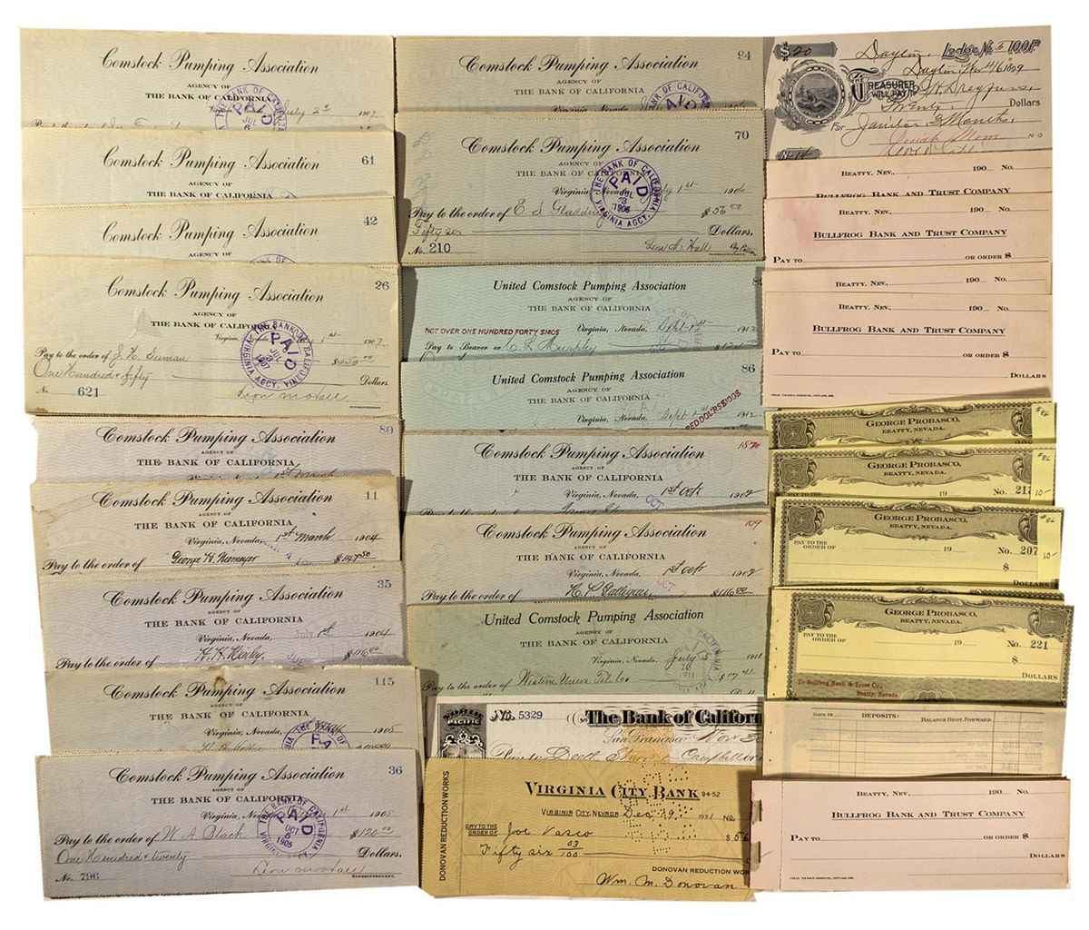 Lot of about 200. Bank checks drawn on the following: Savage Mining Co., ca. 1903, First National Bank in Reno, ca. 1930s, Midway Milling Co. (unissued), ca. 190_, Tonopah Divide Mining Co., ca. 1930s, Savage Mine, ca. 1866-1875 (duplicates), Washoe County Bank (unissued), ca. 1920s, Virginia City Bank, ca. 1930s, United Comstock Pumping Association, ca. 1902-1912, Bullfrog Bank and Trust Co., Beatty, Nevada (unissued). One North Pacific Transportation Company bank check No. 5329 issued in 1870. Signed by J. Branham, RN-B17c. Lot includes 2 deposit books mostly unused, stubs attached and still bound (Bullfrog Bank and Trust Co., Beatty, NV. This collection spans 75 years of tumutuous banking history in Nevada including the productive Comstock era of Virginia City.