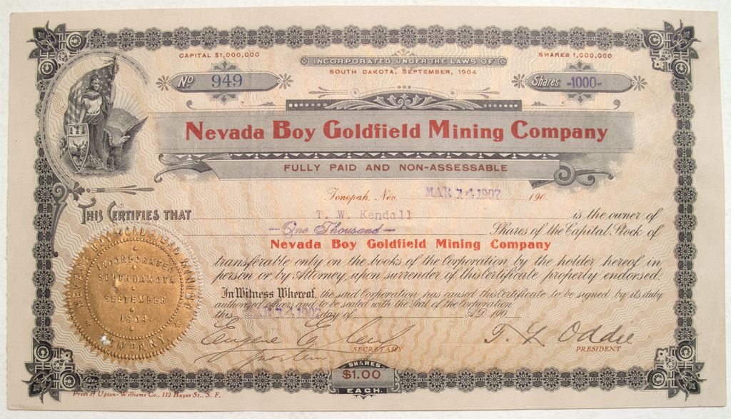 #949 for 1,000 shares to T. W. Kendall in 1907. Signed by secretary ? and president Tasker Oddie (future Nevada Governor and Senator). George Wingfield had purchased this property from Tom Kendall in 1904. Nice history.