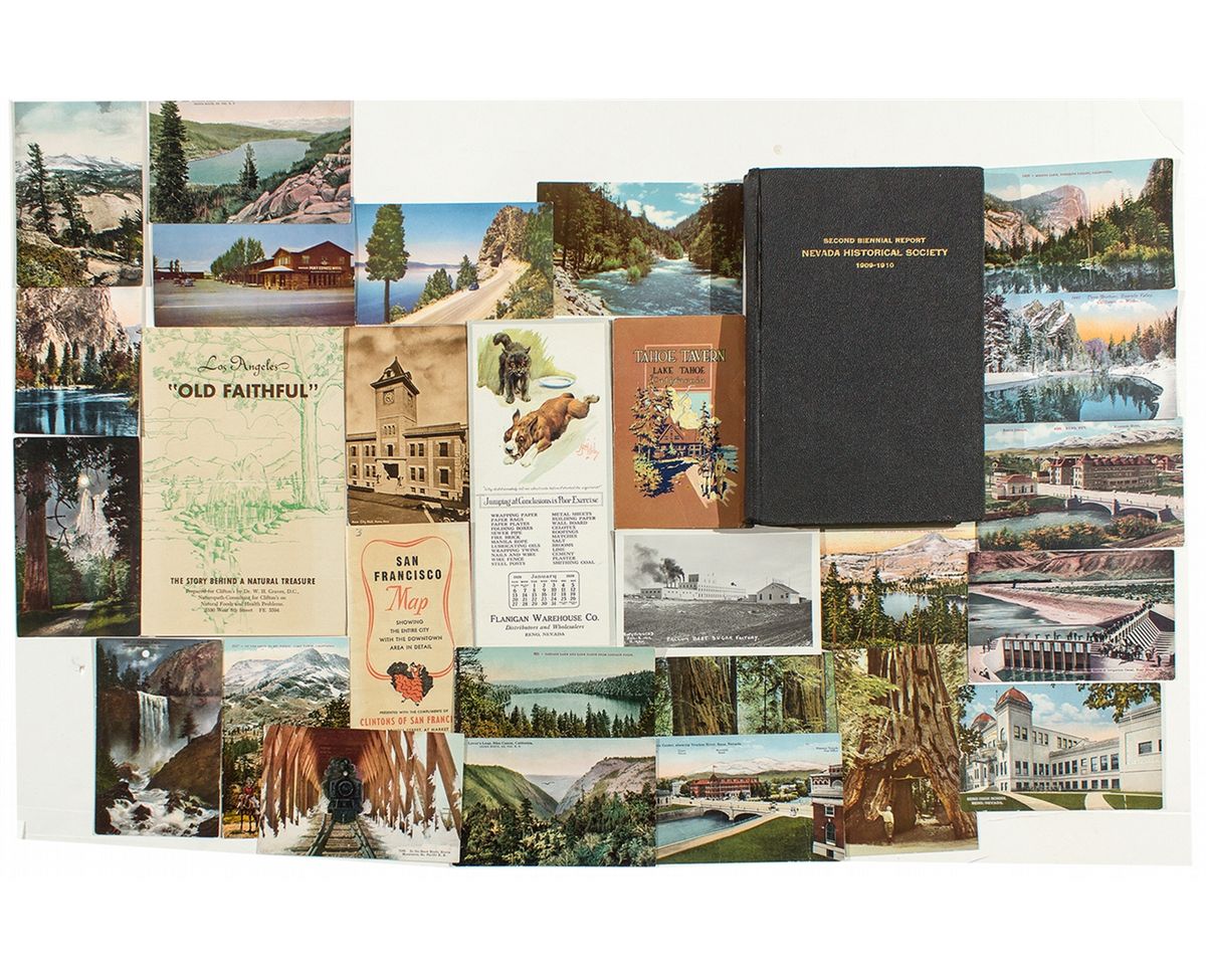 1909 This lot contains several interesting pieces relating to both Nevada and California. The main attraction of this collection of RPCs and brochures has to be the Second Biennial Report by The Nevada Historical Society for 1909-1910. Although it could use repair on its binding, this hardcover publication is in pretty good condition and is chock full of historical facts and pictures of Nevada from as far back as the 1860’s. Also included in this lot are 30 RPC and colorized cards showing various views of Tahoe and Yosemite National Park, and Reno and the surrounding area. There is a pamphlet on Los Angeles's "Old Faithful" geyser, a Clinton's map of San Francisco, and a small 1929 calender. This is a very eclectic and varied group that can enhance or start a collection. - HKA#65300